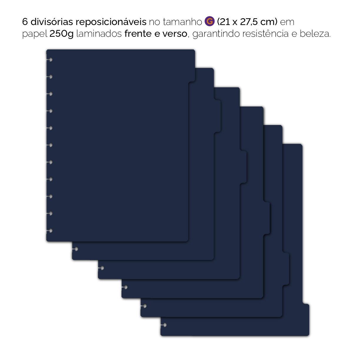 A embalagem contém 6 divisórias no tamanho “G” (21 x 27,5 cm) que podem ser colocadas em qualquer local do caderno. Elas são impressas com tecnologia digital de alta qualidade em papel couché 250 g, com laminação frente e verso, o que as torna mais protegidas e resistentes.