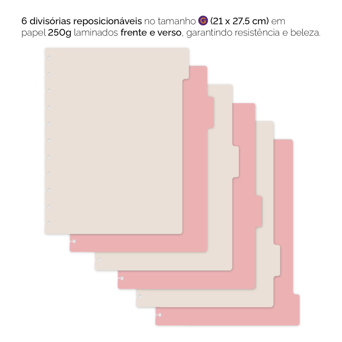 São 6 divisórias laminadas (frente e verso), tamanho “G” (21 x 27,5 cm), em papel 250 g.