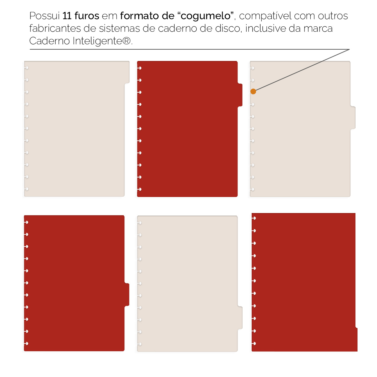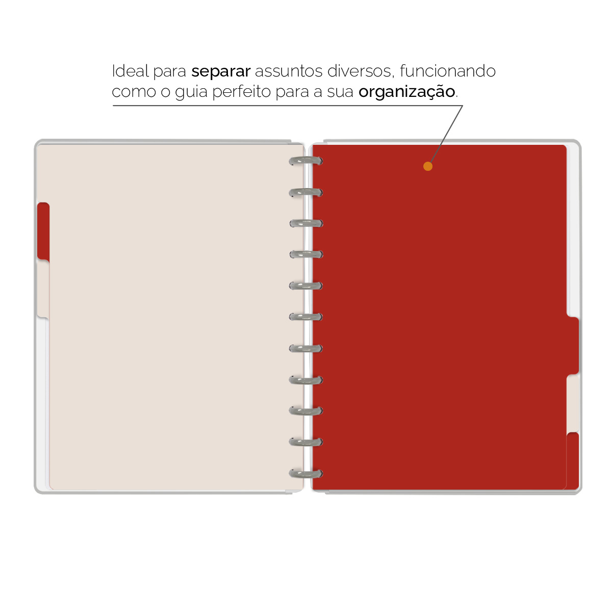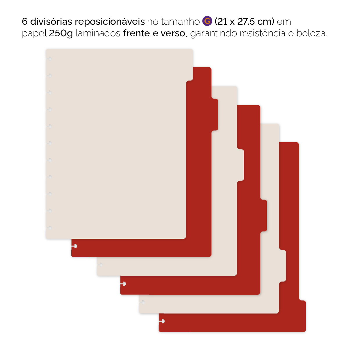 A embalagem contém 6 divisórias no tamanho “G” (21 x 27,5 cm) que podem ser colocadas em qualquer local do caderno. Elas são impressas com tecnologia digital de alta qualidade em papel couché 250 g, com laminação frente e verso, o que as torna mais protegidas e resistentes.