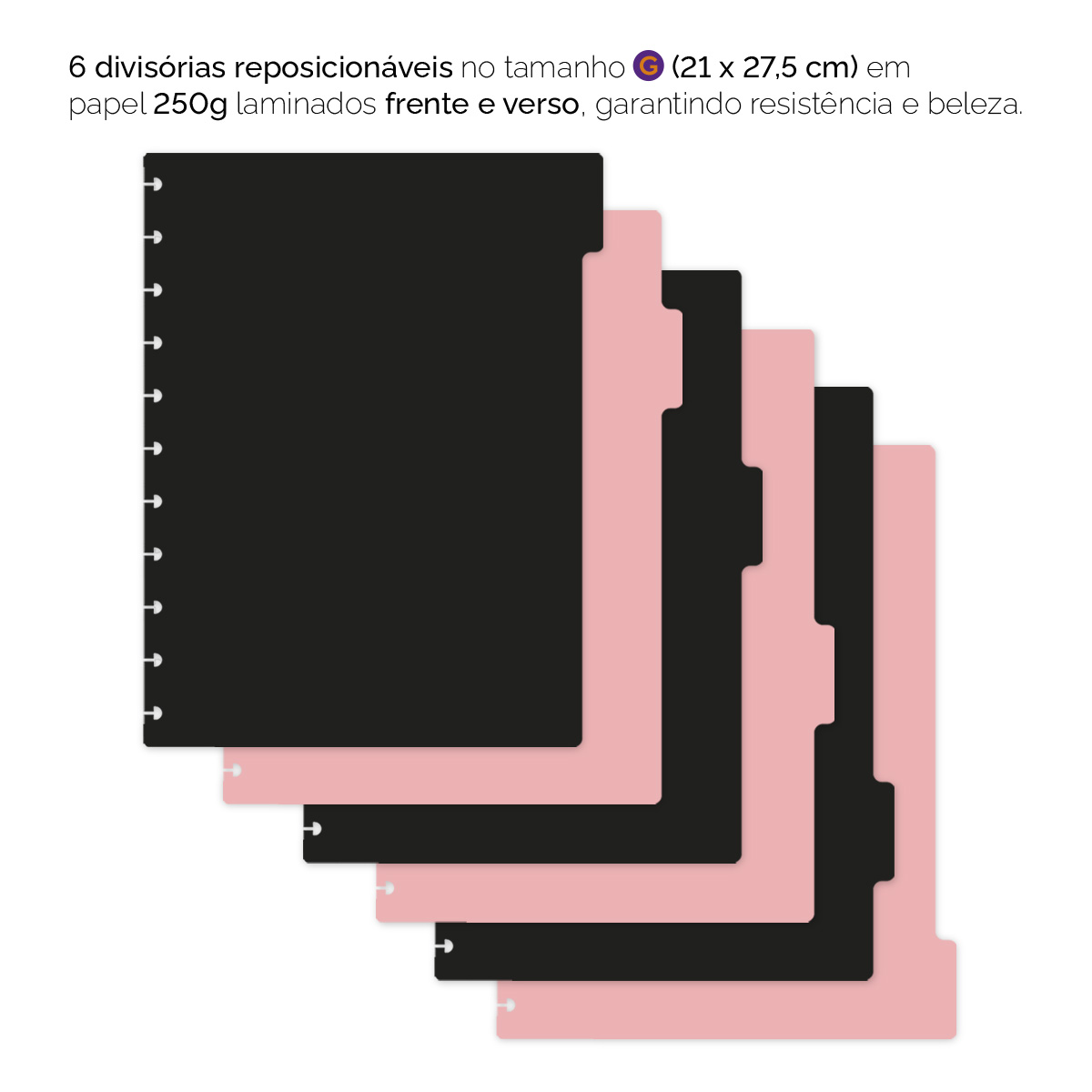 A embalagem contém 6 divisórias no tamanho “G” (21 x 27,5 cm) que podem ser colocadas em qualquer local do caderno. Elas são impressas com tecnologia digital de alta qualidade em papel couché 250 g, com laminação frente e verso, o que as torna mais protegidas e resistentes.