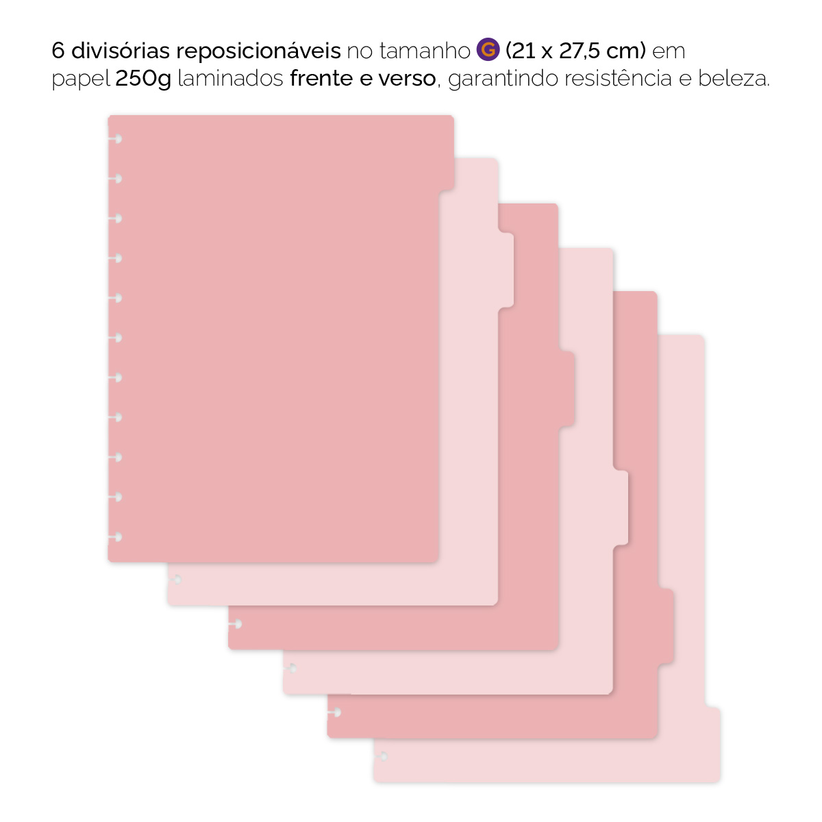 A embalagem contém 6 divisórias no tamanho “G” (21 x 27,5 cm) que podem ser colocadas em qualquer local do caderno. Elas são impressas com tecnologia digital de alta qualidade em papel couché 250 g, com laminação frente e verso, o que as torna mais protegidas e resistentes.