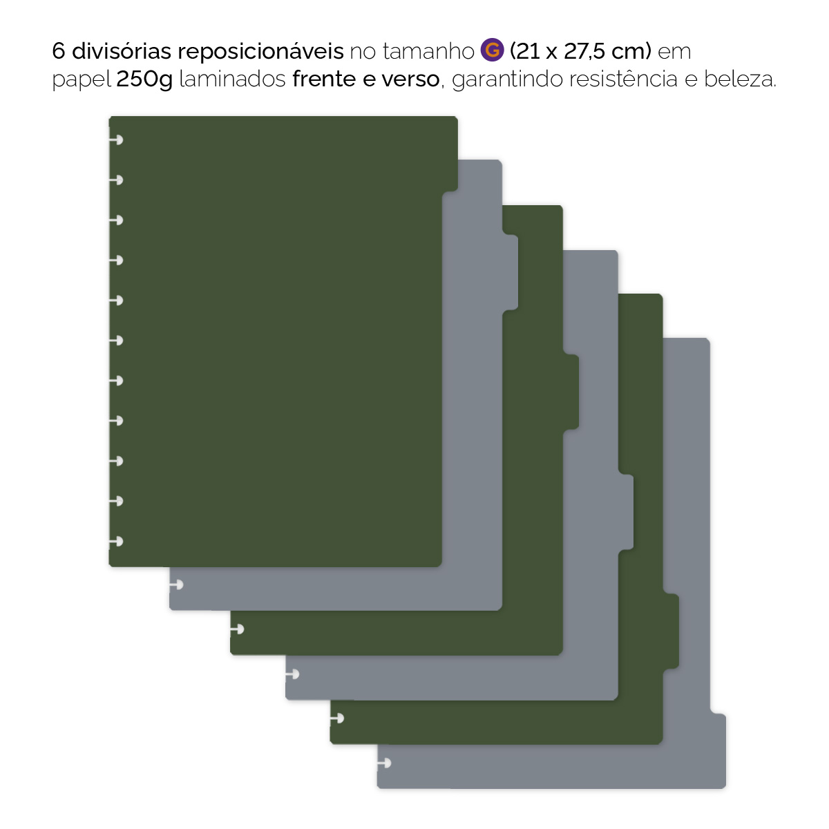 São 6 divisórias laminadas (frente e verso), tamanho “G” (21 x 27,5 cm), em papel 250 g.