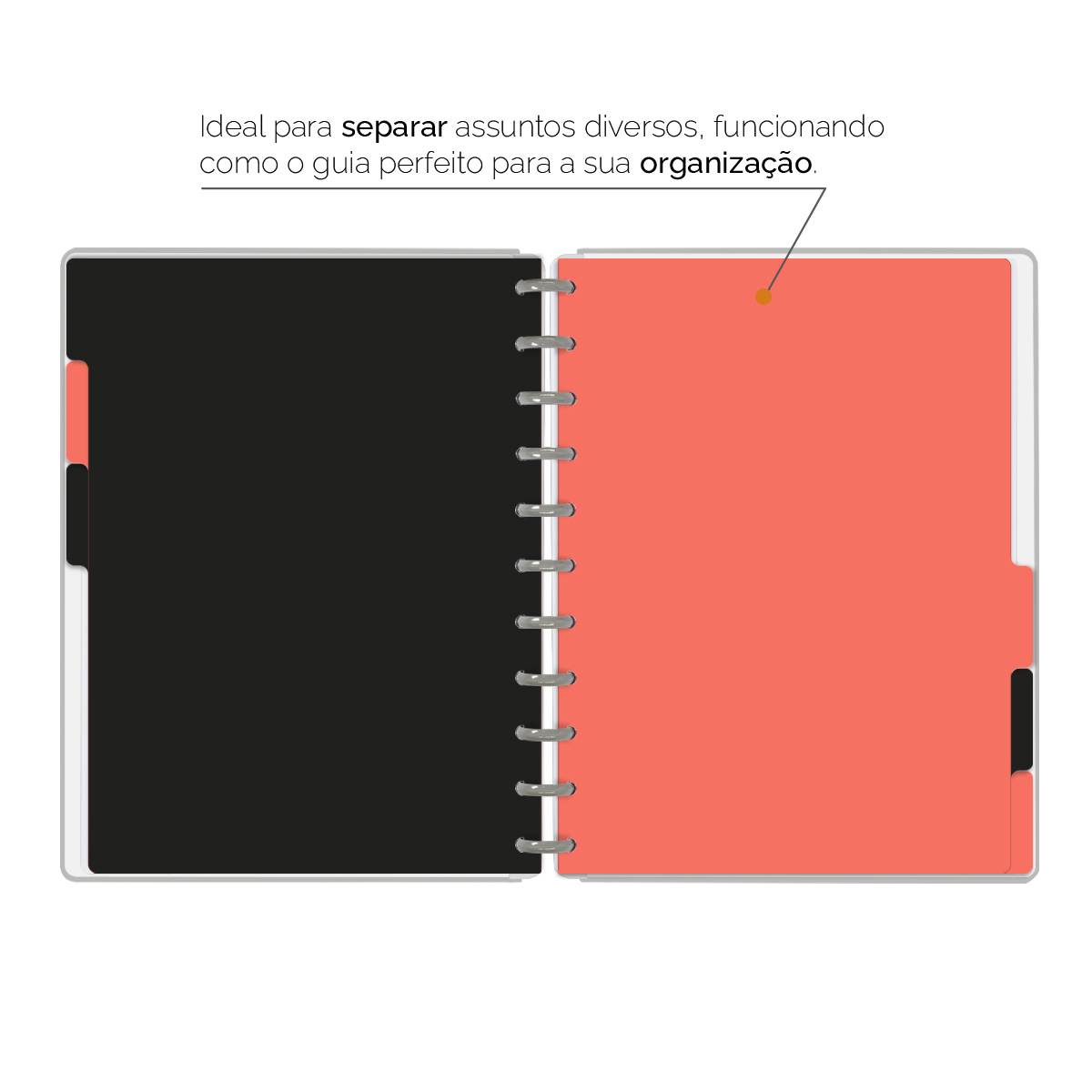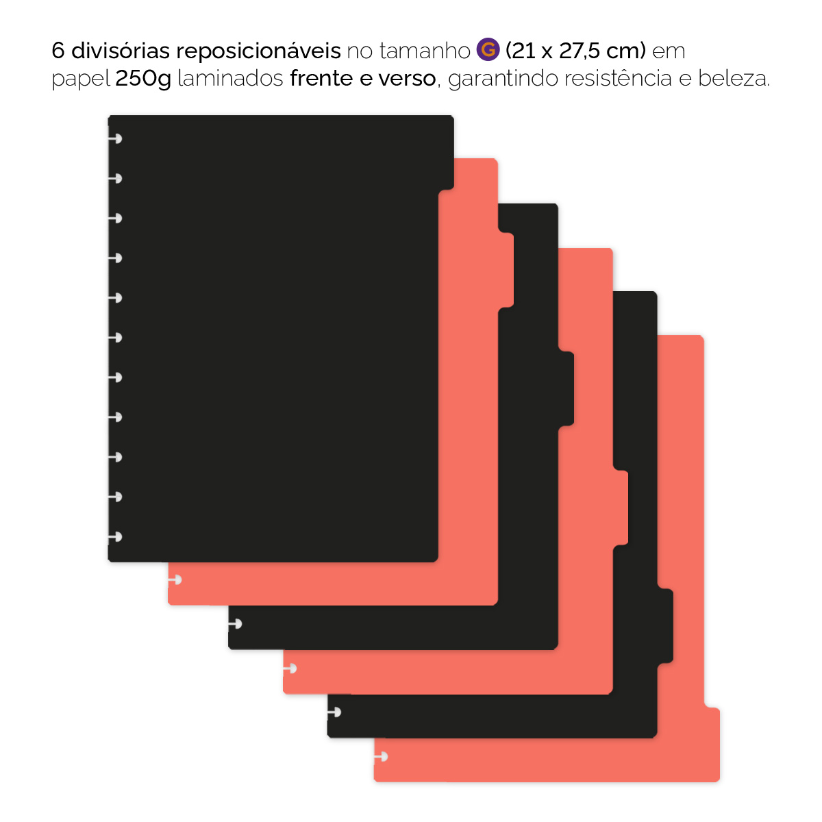 A embalagem contém 6 divisórias no tamanho “G” (21 x 27,5 cm) que podem ser colocadas em qualquer local do caderno. Elas são impressas com tecnologia digital de alta qualidade em papel couché 250 g, com laminação frente e verso, o que as torna mais protegidas e resistentes.