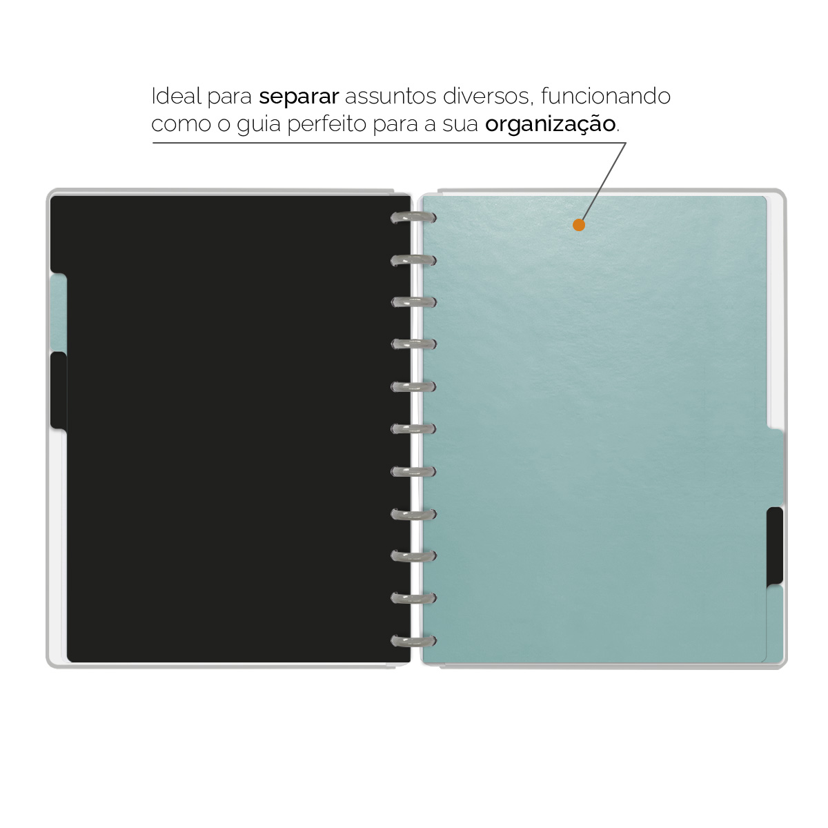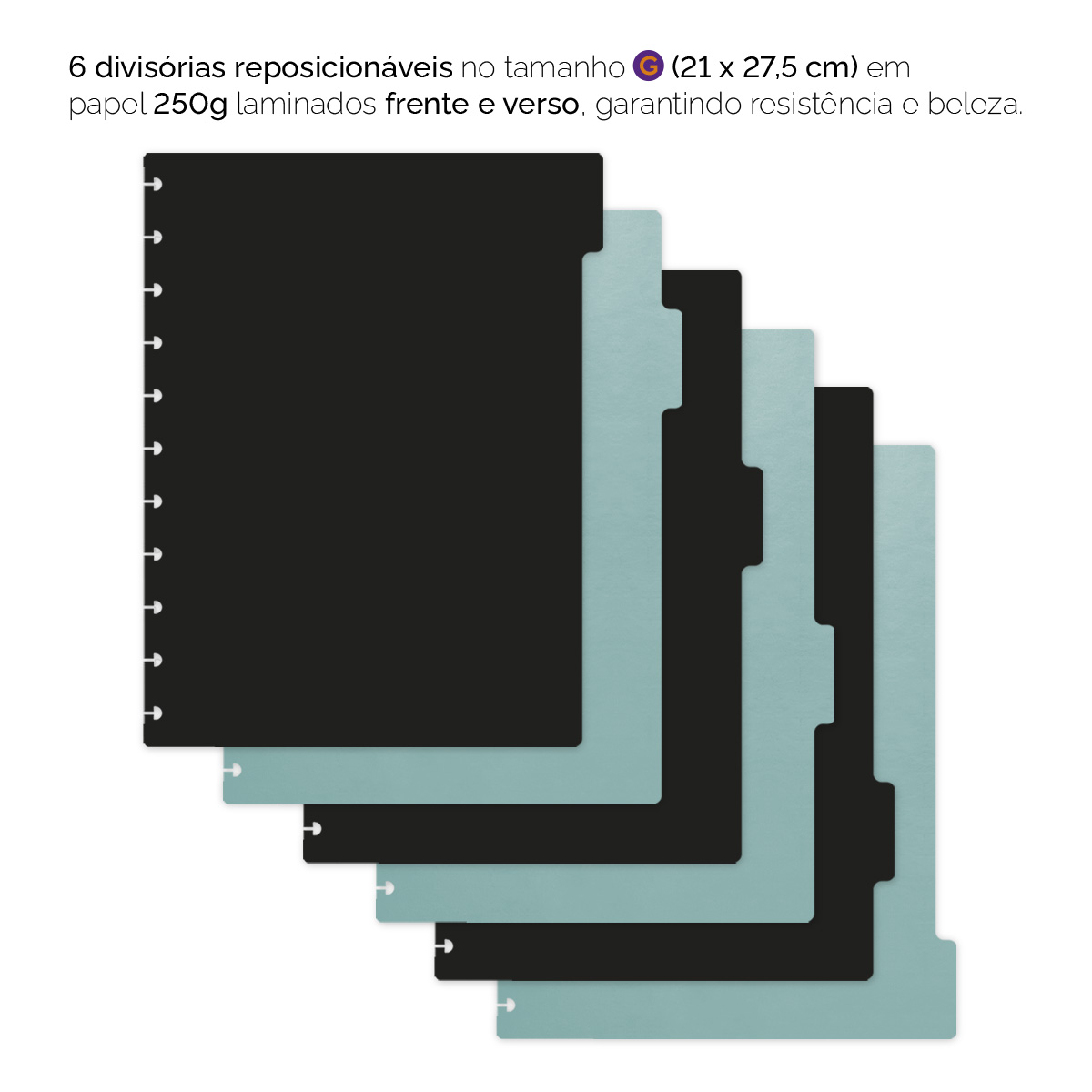 A embalagem contém 6 divisórias no tamanho “G” (21 x 27,5 cm) que podem ser colocadas em qualquer local do caderno. Elas são impressas com tecnologia digital de alta qualidade em papel couché 250 g, com laminação frente e verso, o que as torna mais protegidas e resistentes.