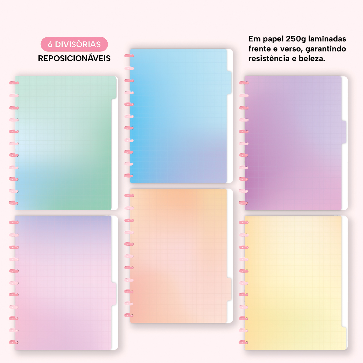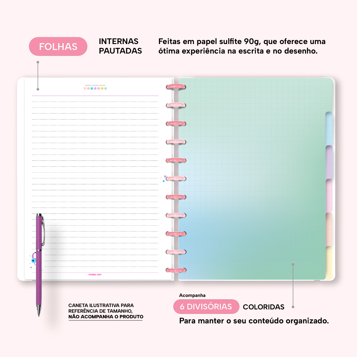 A capa é feita em PP com impressão digital UV de alta definição, acompanha 4 lindas divisórias, que você pode colocar em qualquer local do caderno, funcionando como o guia perfeito para sua organização.