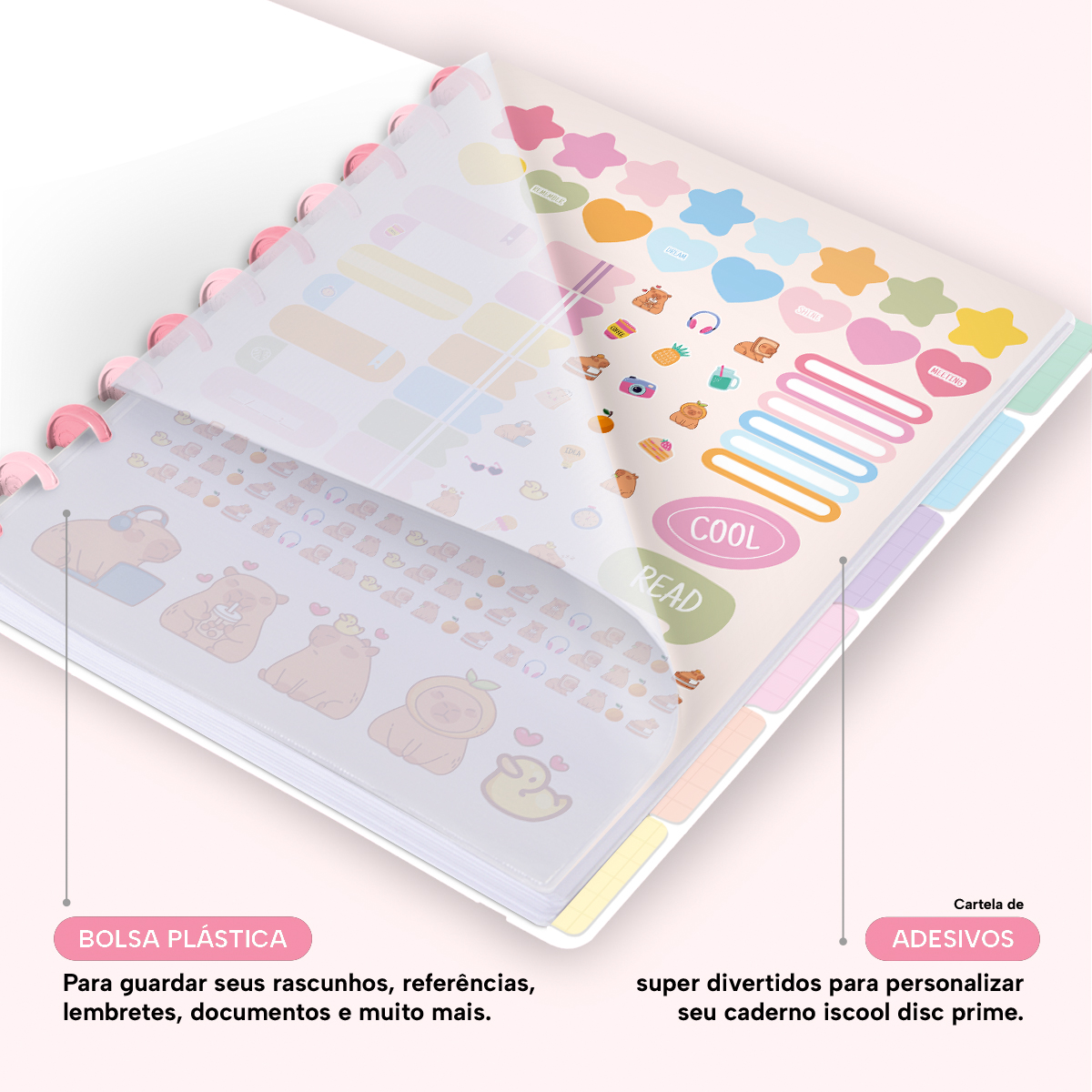 Além de tudo isso, o Iscool Disc Flex, conta com detalhezinhos que fazem toda diferença: elástico removível para fechamento da capa, muito mais estilo e privacidade para suas anotações; bolsa plástica para guardar seus rascunhos, referências, lembretes, documentos e uma cartela de adesivos incríveis, para que você possa personalizar seu caderno do seu jeitinho!