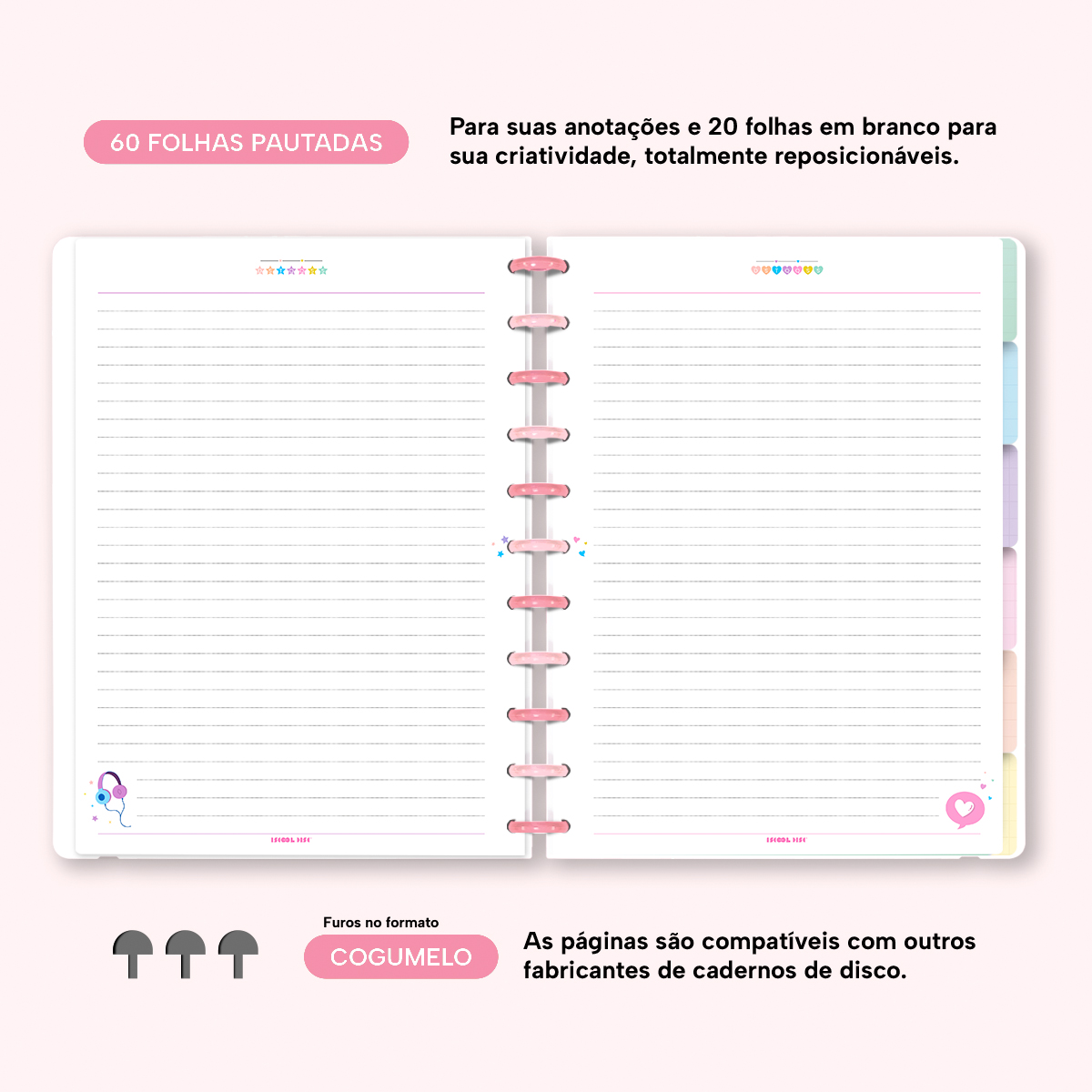 Com furos no formato de “cogumelo”, você poderá “dar um up” em seu caderno com nossos refis, além de ser compatível com outros fabricantes de cadernos de discos.