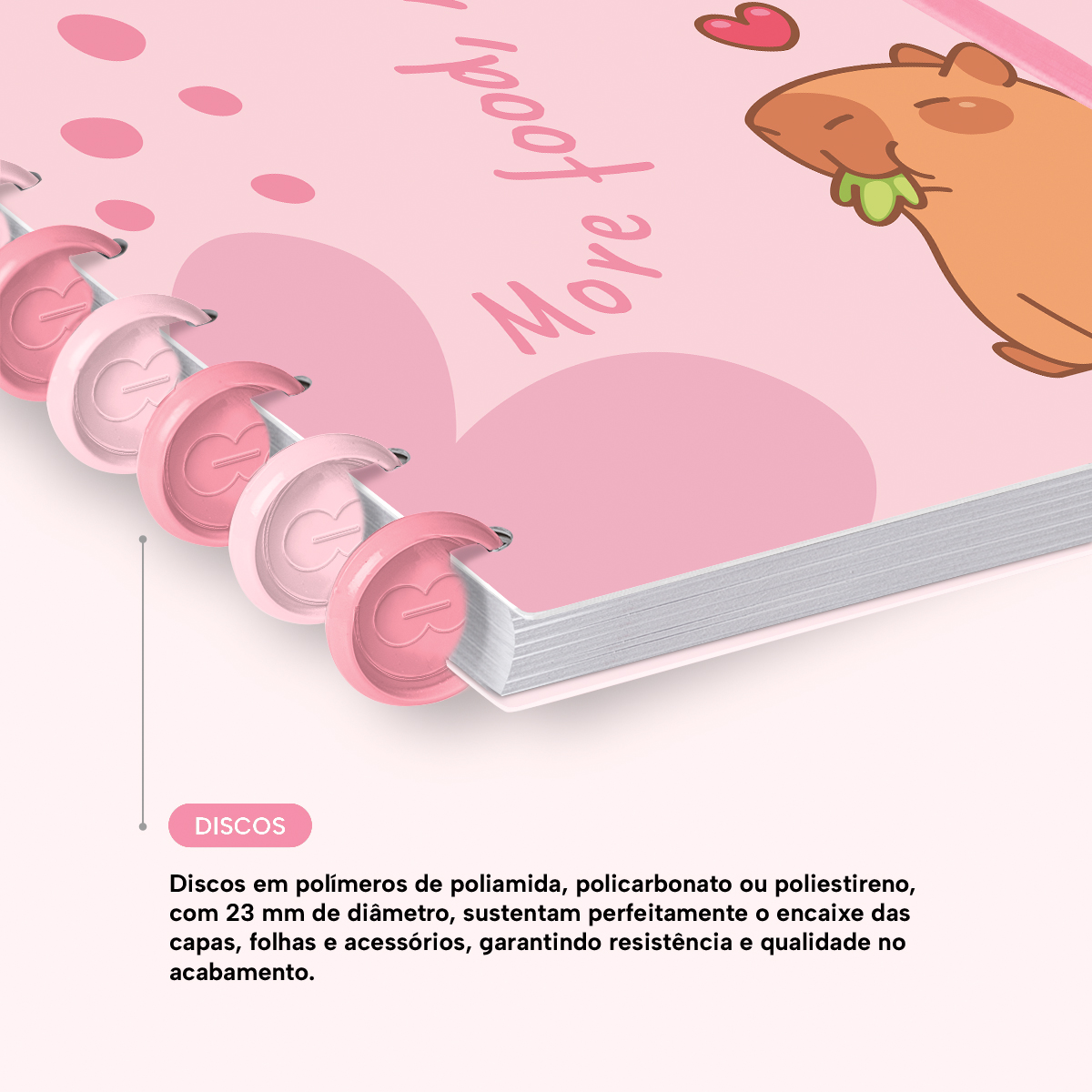 Os nossos discos são fabricados em polímero de nylon e/ou policarbonato, podem ser substituídos, proporcionando imensa variedade na combinação das cores, qualidade no acabamento e eficácia no encaixe das capas, folhas e acessórios.