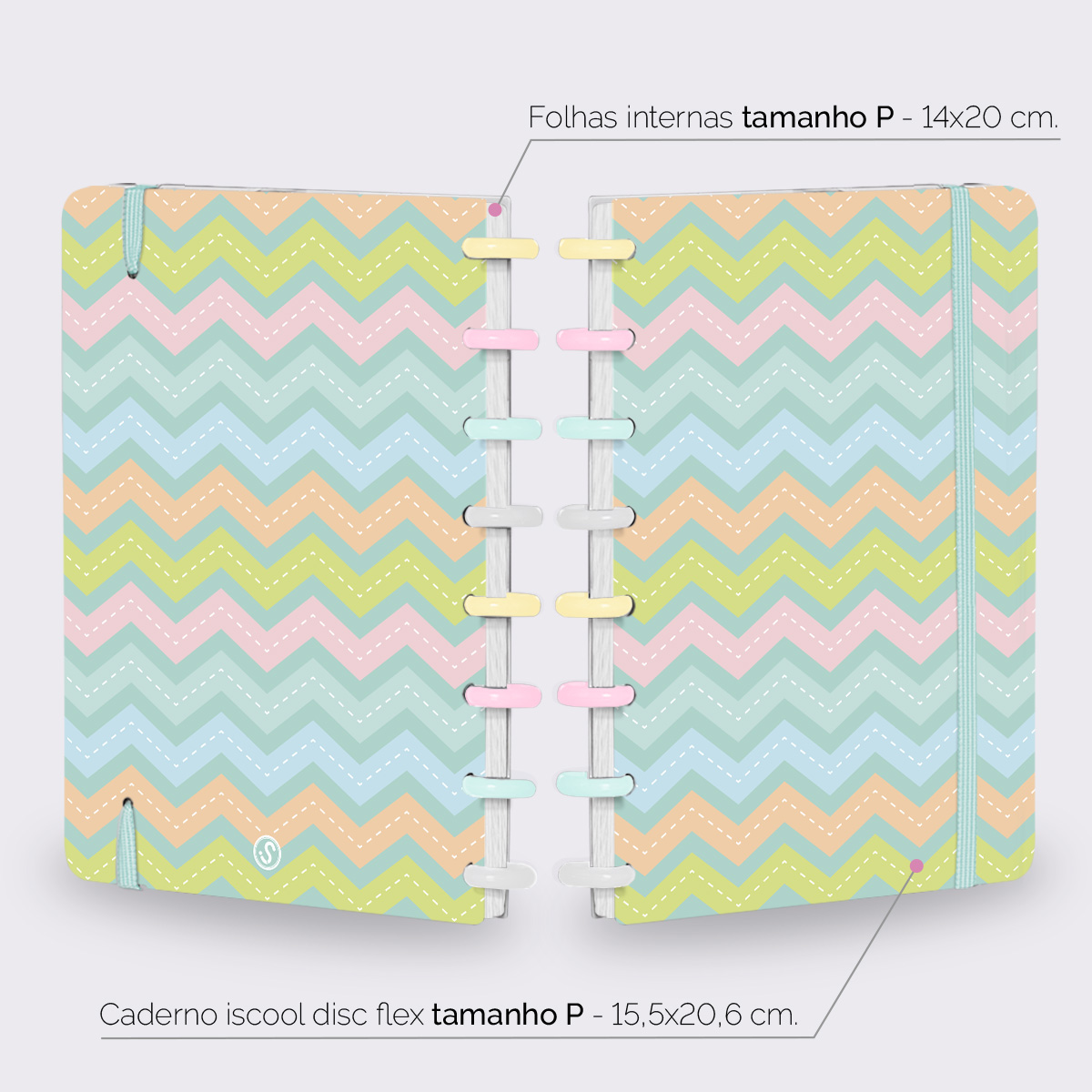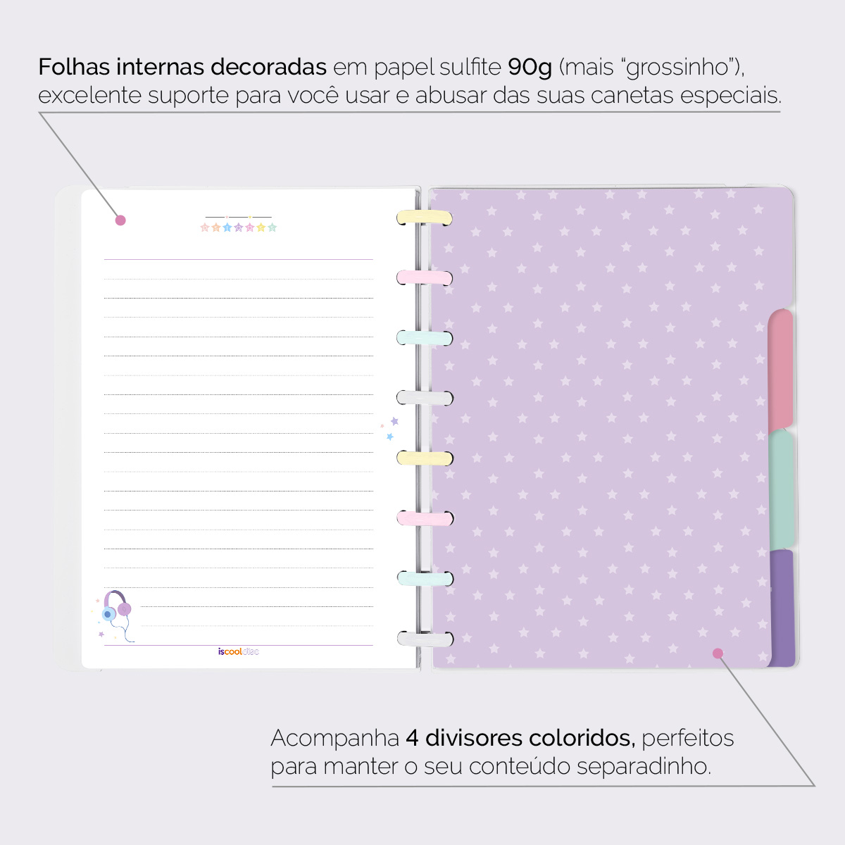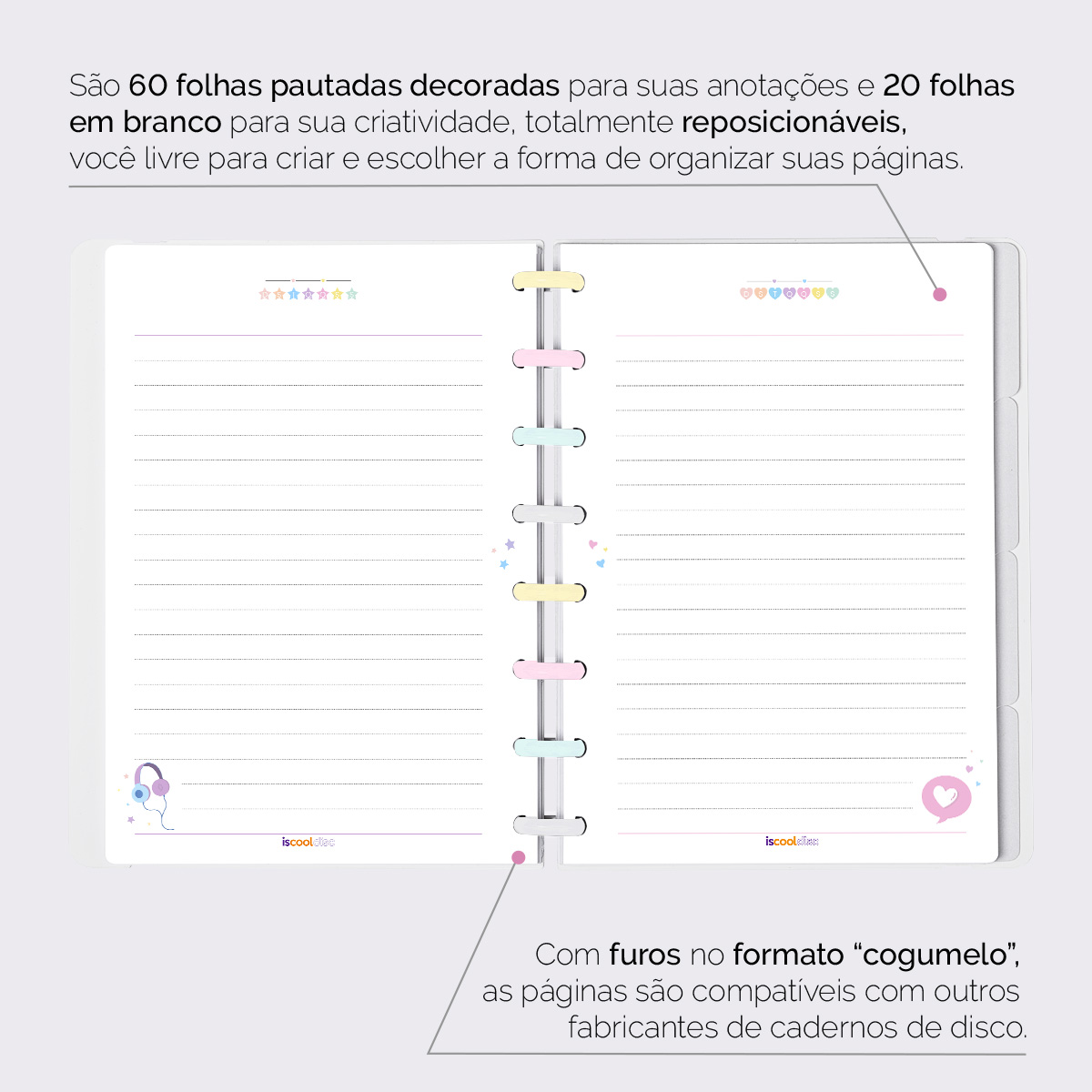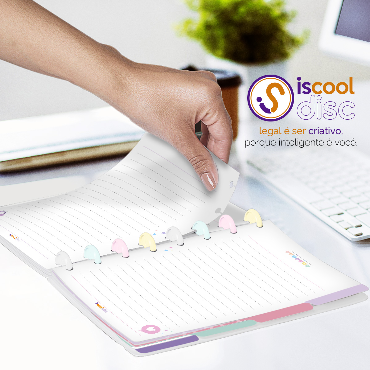 Além de tudo isso, o ISCOOL DISC FLEX, conta com detalhezinhos que fazem toda diferença: elástico removível para fechamento da capa, muito mais estilo e privacidade para suas anotações; bolsa plástica para guardar seus rascunhos, referências, lembretes, documentos e uma cartela de adesivos incríveis, para que você possa personalizar seu caderno do seu jeitinho!