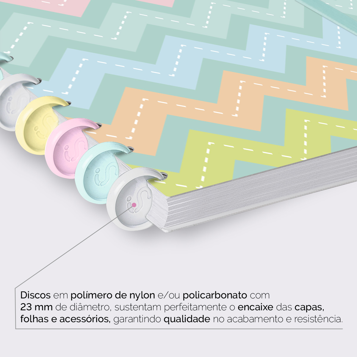 Encadernado com 11 discos M de 23mm em polímero de nylon e/ou policarbonato coloridos, fabricados no Brasil.