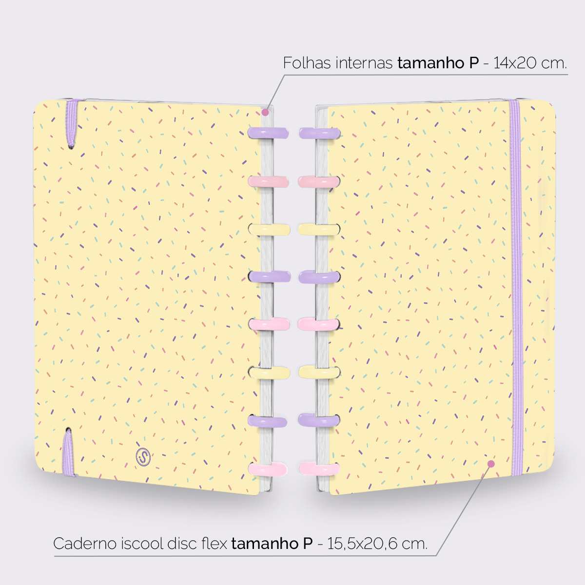 Além de tudo isso, o ISCOOL DISC FLEX, conta com detalhezinhos que fazem toda diferença: elástico removível para fechamento da capa, muito mais estilo e privacidade para suas anotações; bolsa plástica para guardar seus rascunhos, referências, lembretes, documentos e uma cartela de adesivos incríveis, para que você possa personalizar seu caderno do seu jeitinho!