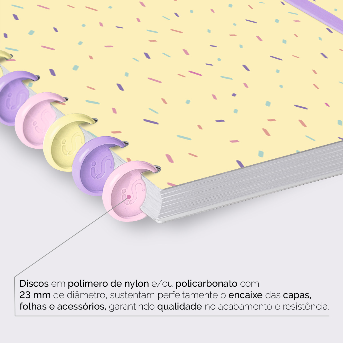 Encadernado com 11 discos M de 23mm em polímero de nylon e/ou policarbonato coloridos, fabricados no Brasil.
