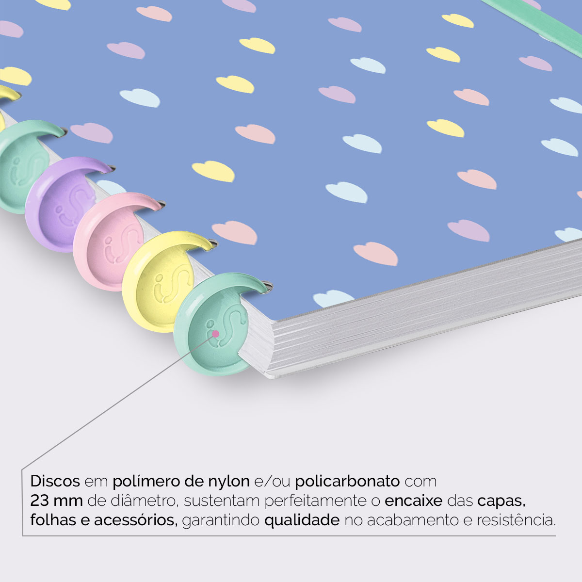 Encadernado com 11 discos M de 23mm em polímero de nylon e/ou policarbonato coloridos, fabricados no Brasil.