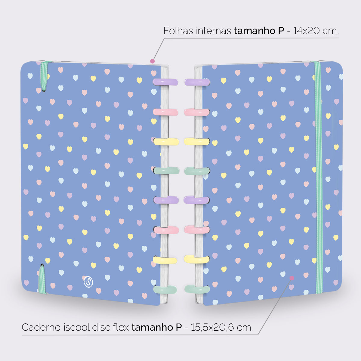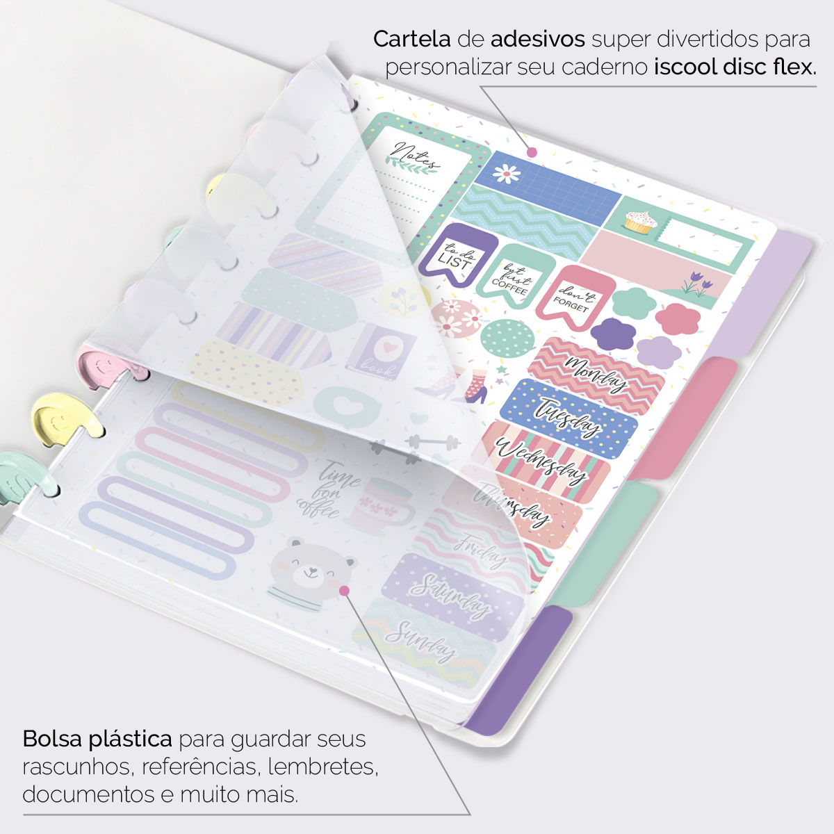 Além de tudo isso, o ISCOOL DISC FLEX, conta com detalhezinhos que fazem toda diferença: elástico removível para fechamento da capa, muito mais estilo e privacidade para suas anotações; bolsa plástica para guardar seus rascunhos, referências, lembretes, documentos e uma cartela de adesivos incríveis, para que você possa personalizar seu caderno do seu jeitinho!