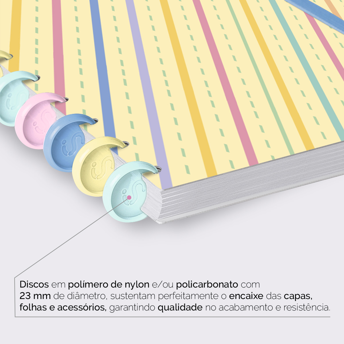 Encadernado com 11 discos M de 23mm em polímero de nylon e/ou policarbonato coloridos, fabricados no Brasil.