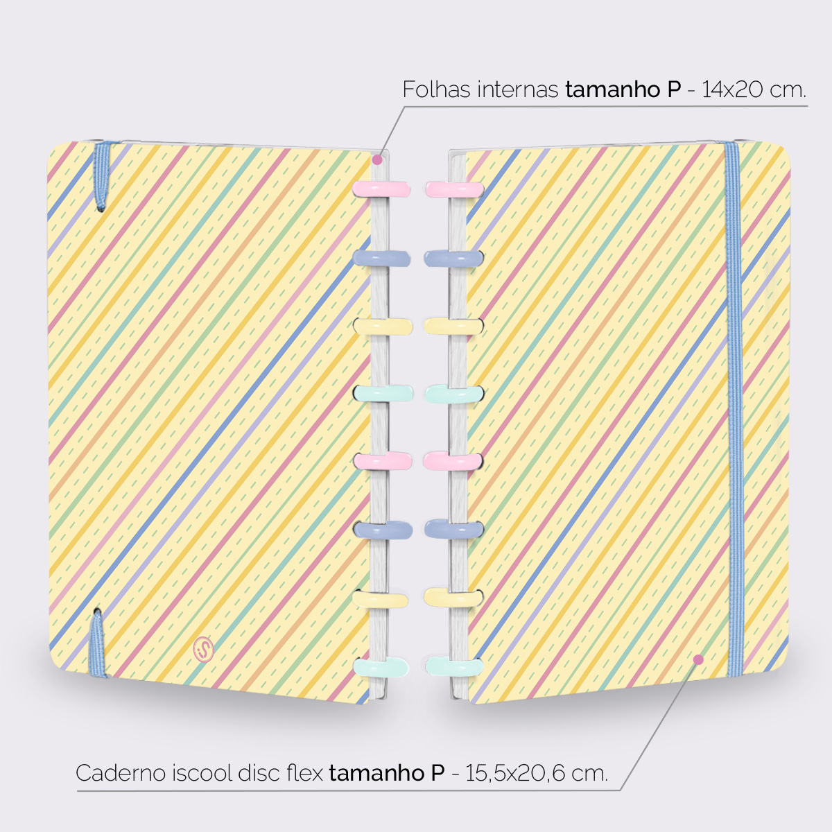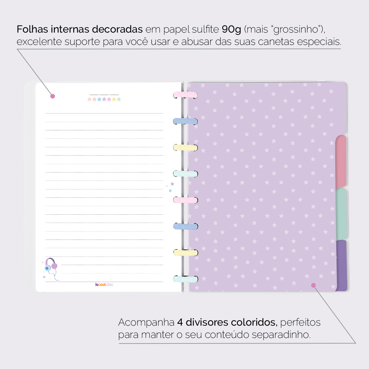 Além de tudo isso, o ISCOOL DISC FLEX, conta com detalhezinhos que fazem toda diferença: elástico removível para fechamento da capa, muito mais estilo e privacidade para suas anotações; bolsa plástica para guardar seus rascunhos, referências, lembretes, documentos e uma cartela de adesivos incríveis, para que você possa personalizar seu caderno do seu jeitinho!