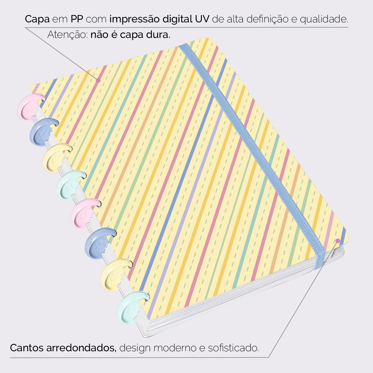A capa é feita em PP com impressão digital UV de alta definição, acompanha 4 lindas divisórias, que você pode colocar em qualquer local do caderno, funcionando como o guia perfeito para sua organização.