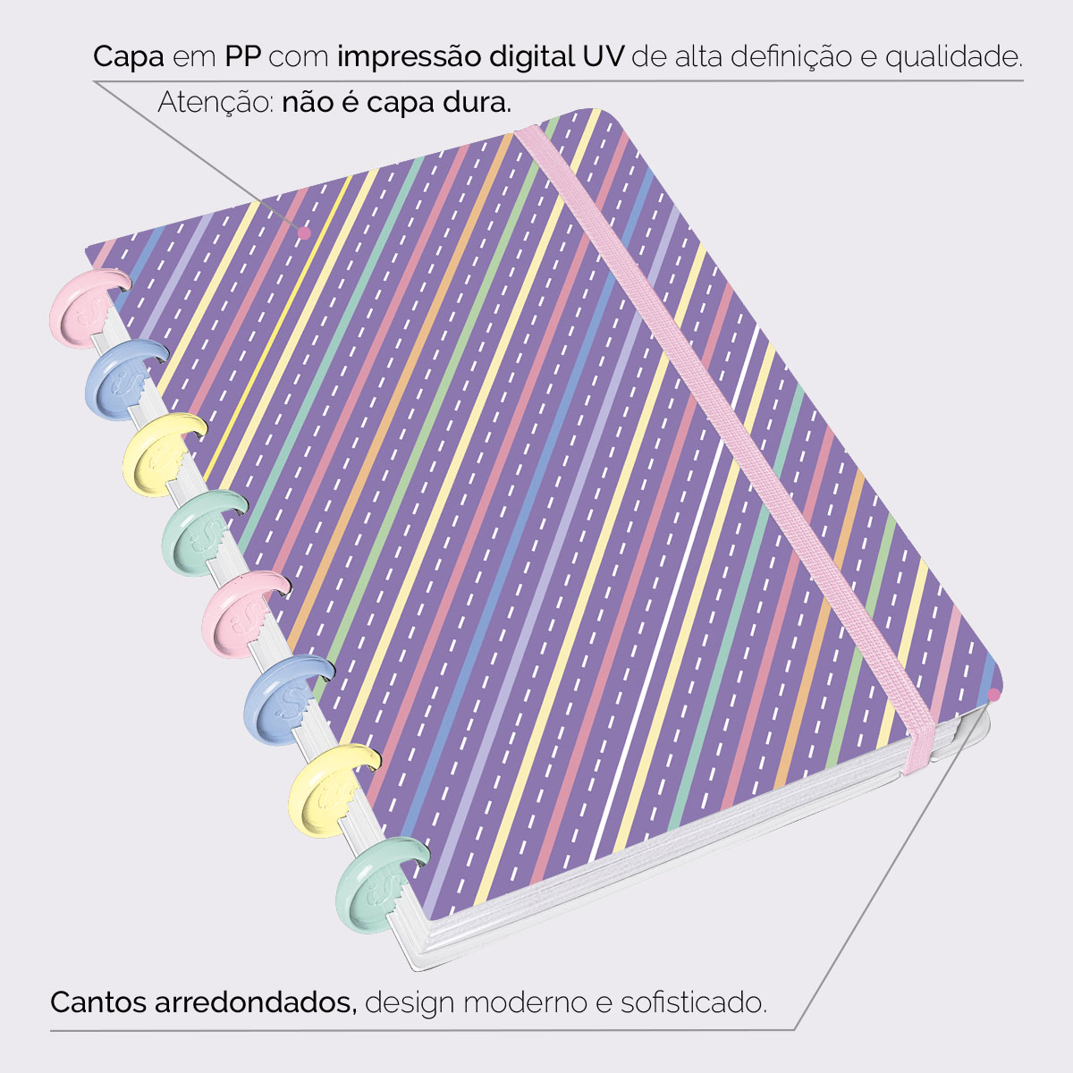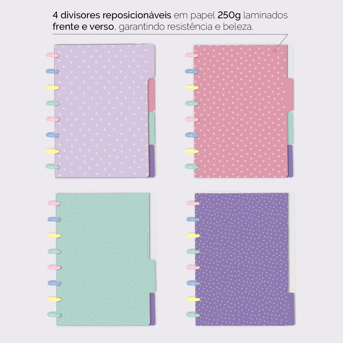 A capa é feita em PP com impressão digital UV de alta definição, acompanha 4 lindas divisórias, que você pode colocar em qualquer local do caderno, funcionando como o guia perfeito para sua organização.