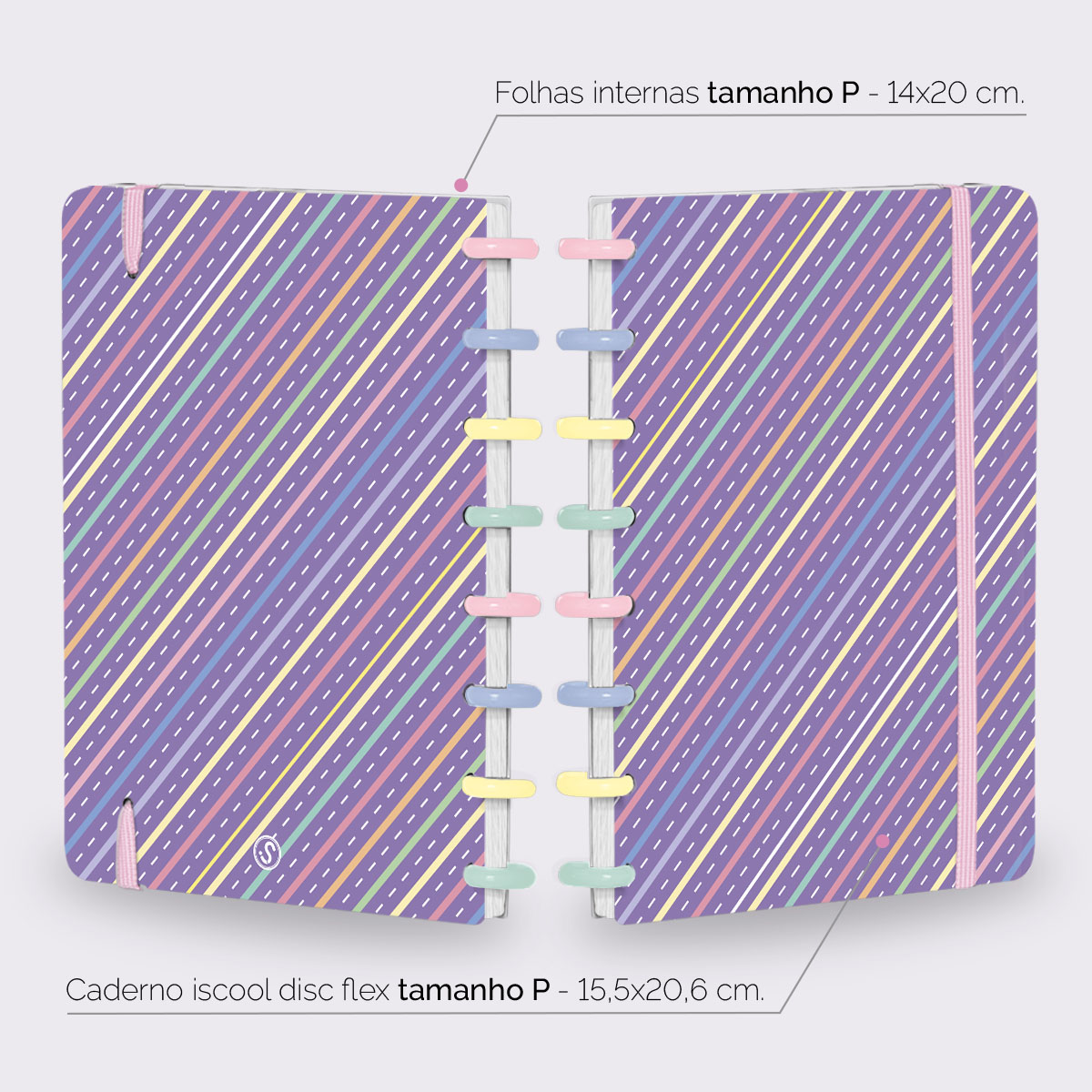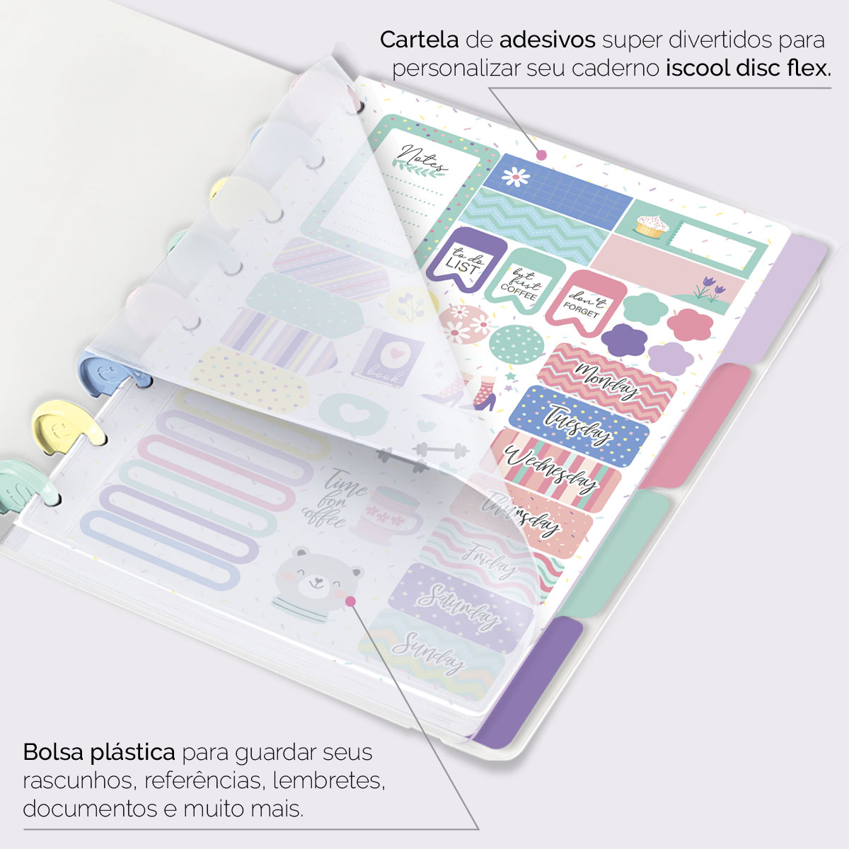 Além de tudo isso, o ISCOOL DISC FLEX, conta com detalhezinhos que fazem toda diferença: elástico removível para fechamento da capa, muito mais estilo e privacidade para suas anotações; bolsa plástica para guardar seus rascunhos, referências, lembretes, documentos e uma cartela de adesivos incríveis, para que você possa personalizar seu caderno do seu jeitinho!