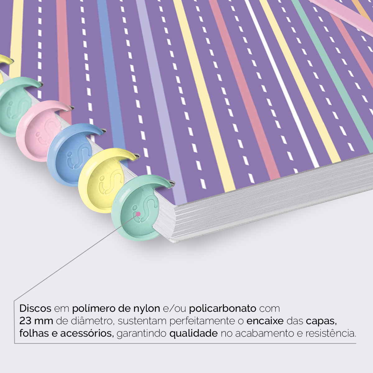 Encadernado com 11 discos M de 23mm em polímero de nylon e/ou policarbonato coloridos, fabricados no Brasil.