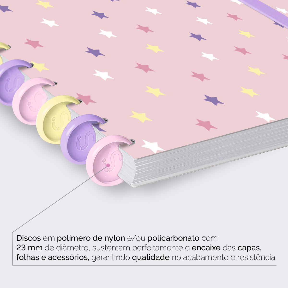 Encadernado com 11 discos M de 23mm em polímero de nylon e/ou policarbonato coloridos, fabricados no Brasil.