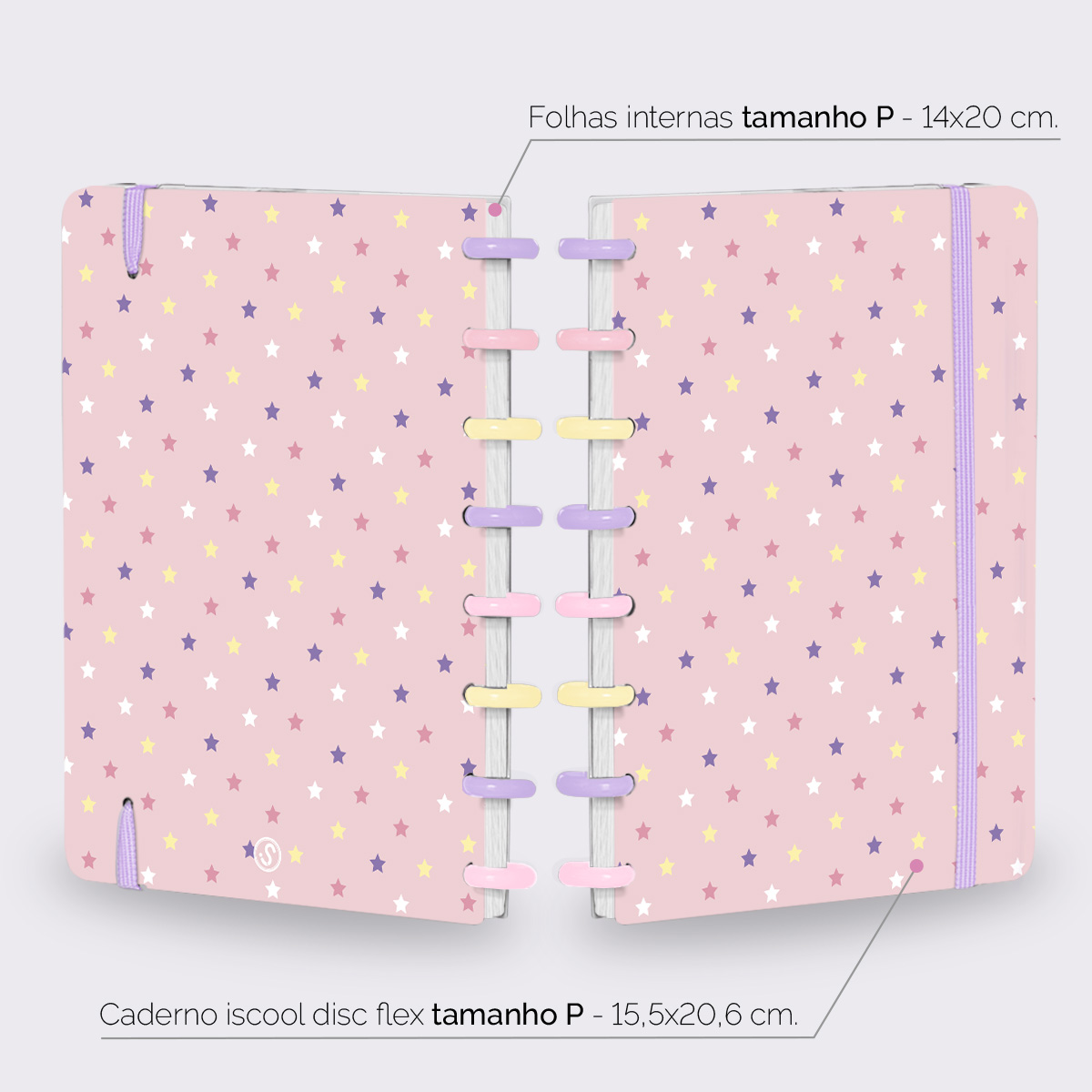 Além de tudo isso, o ISCOOL DISC FLEX, conta com detalhezinhos que fazem toda diferença: elástico removível para fechamento da capa, muito mais estilo e privacidade para suas anotações; bolsa plástica para guardar seus rascunhos, referências, lembretes, documentos e uma cartela de adesivos incríveis, para que você possa personalizar seu caderno do seu jeitinho!