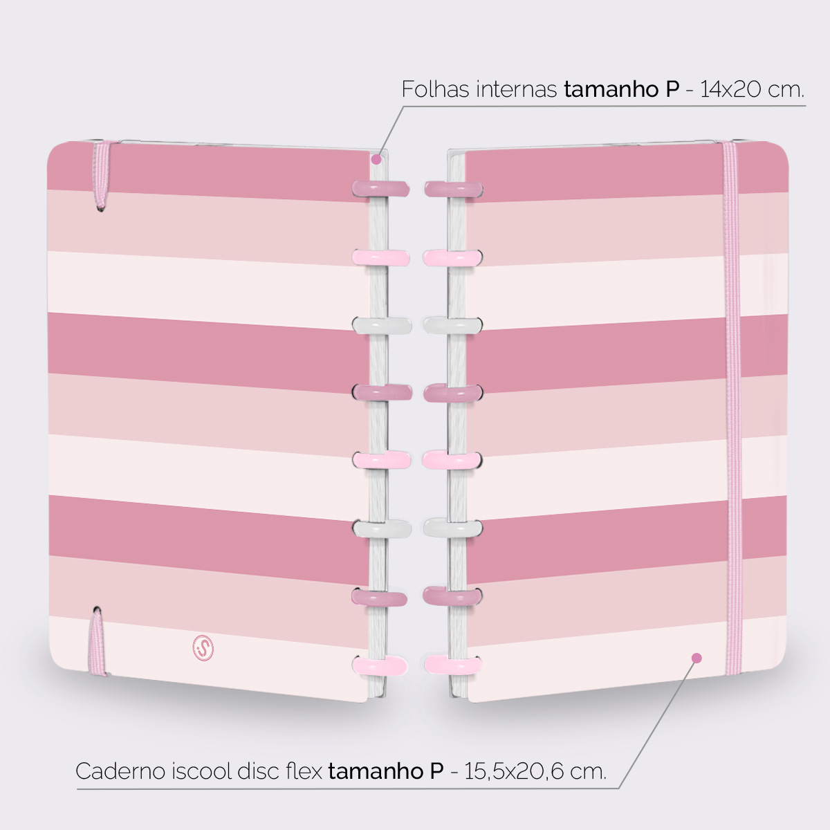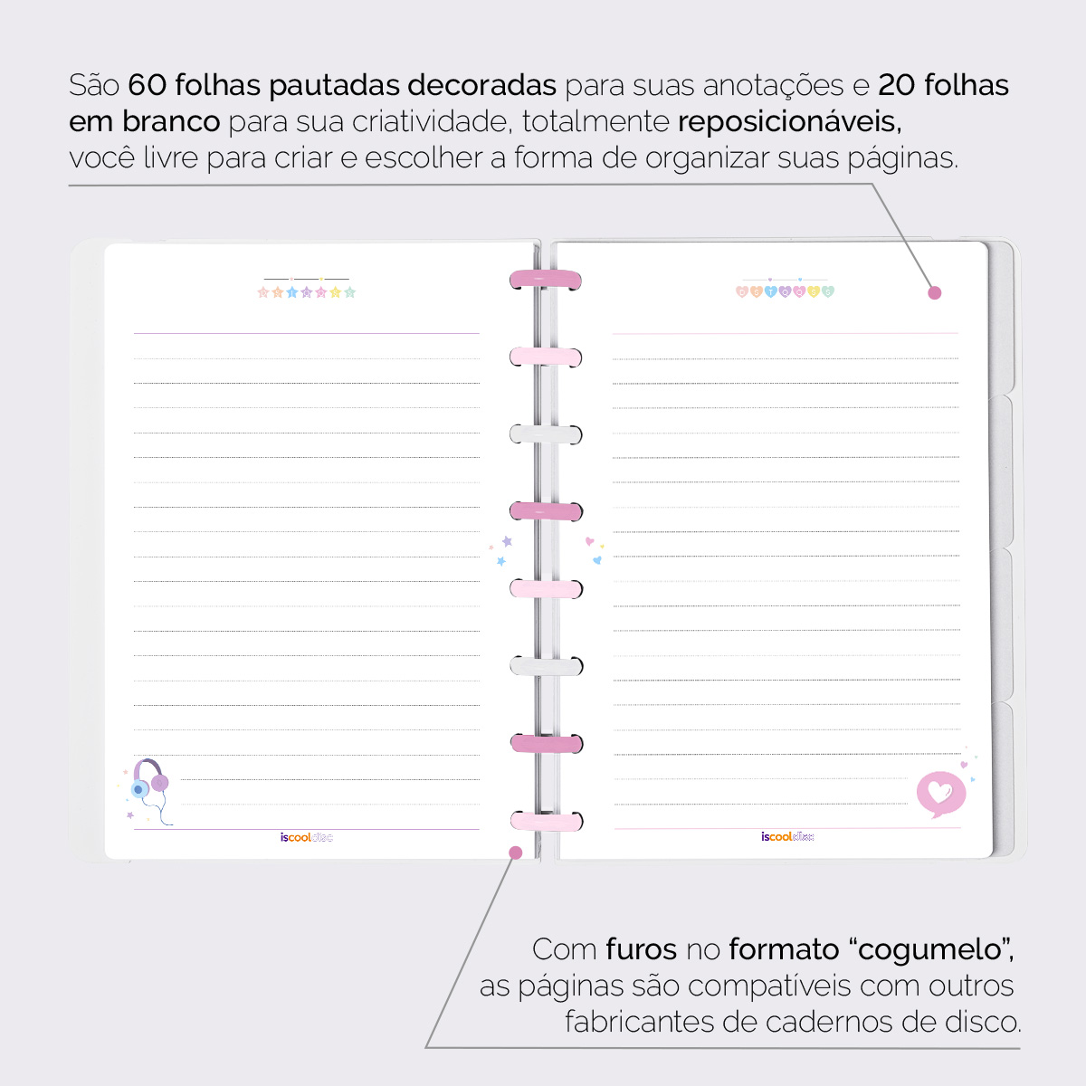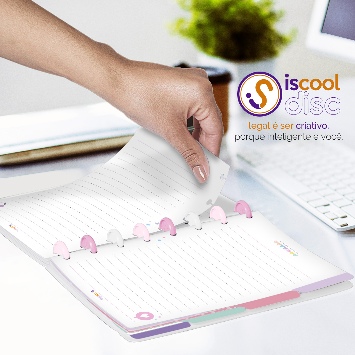 Além de tudo isso, o ISCOOL DISC FLEX, conta com detalhezinhos que fazem toda diferença: elástico removível para fechamento da capa, muito mais estilo e privacidade para suas anotações; bolsa plástica para guardar seus rascunhos, referências, lembretes, documentos e uma cartela de adesivos incríveis, para que você possa personalizar seu caderno do seu jeitinho!