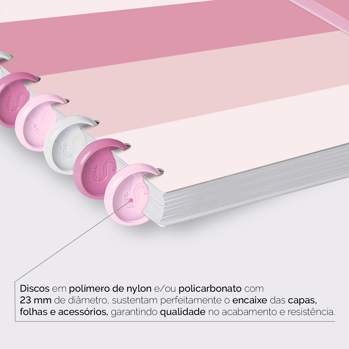 Encadernado com 11 discos M de 23mm em polímero de nylon e/ou policarbonato coloridos, fabricados no Brasil.