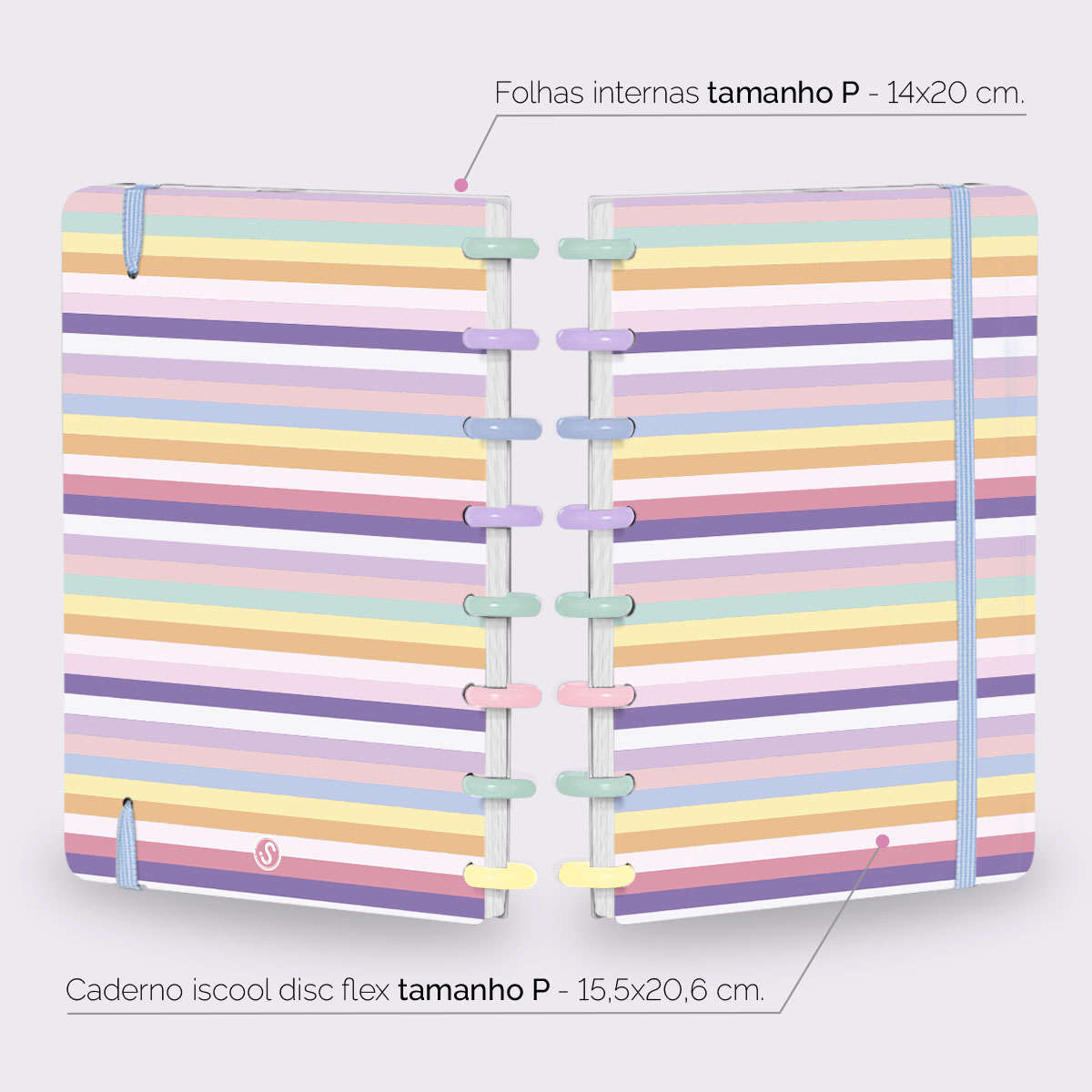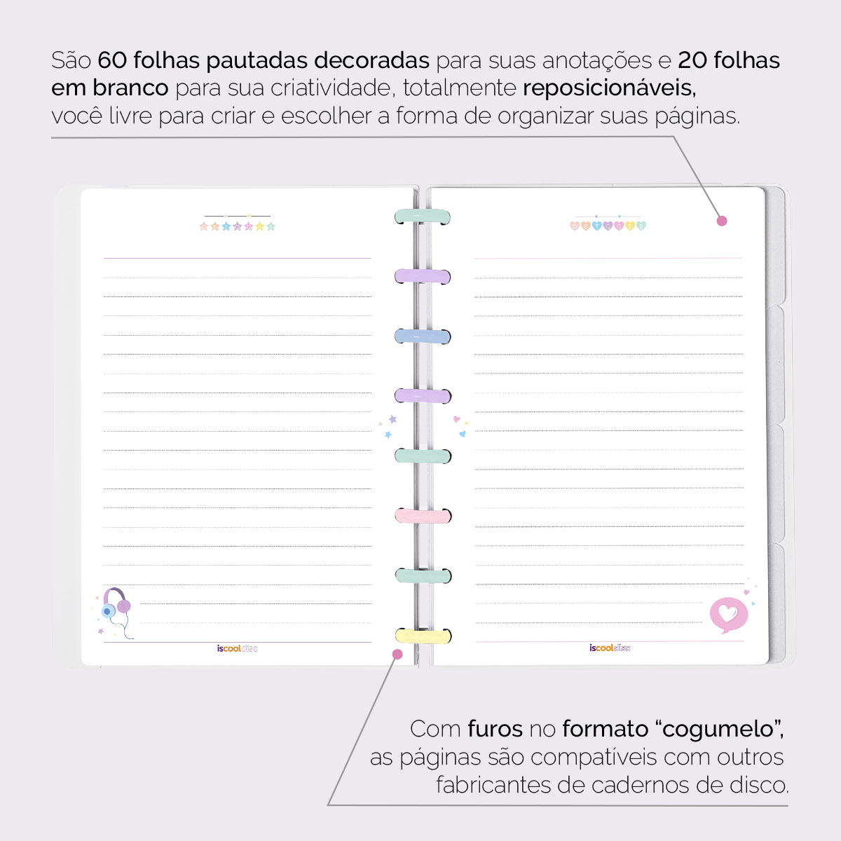 Além de tudo isso, o ISCOOL DISC FLEX, conta com detalhezinhos que fazem toda diferença: elástico removível para fechamento da capa, muito mais estilo e privacidade para suas anotações; bolsa plástica para guardar seus rascunhos, referências, lembretes, documentos e uma cartela de adesivos incríveis, para que você possa personalizar seu caderno do seu jeitinho!