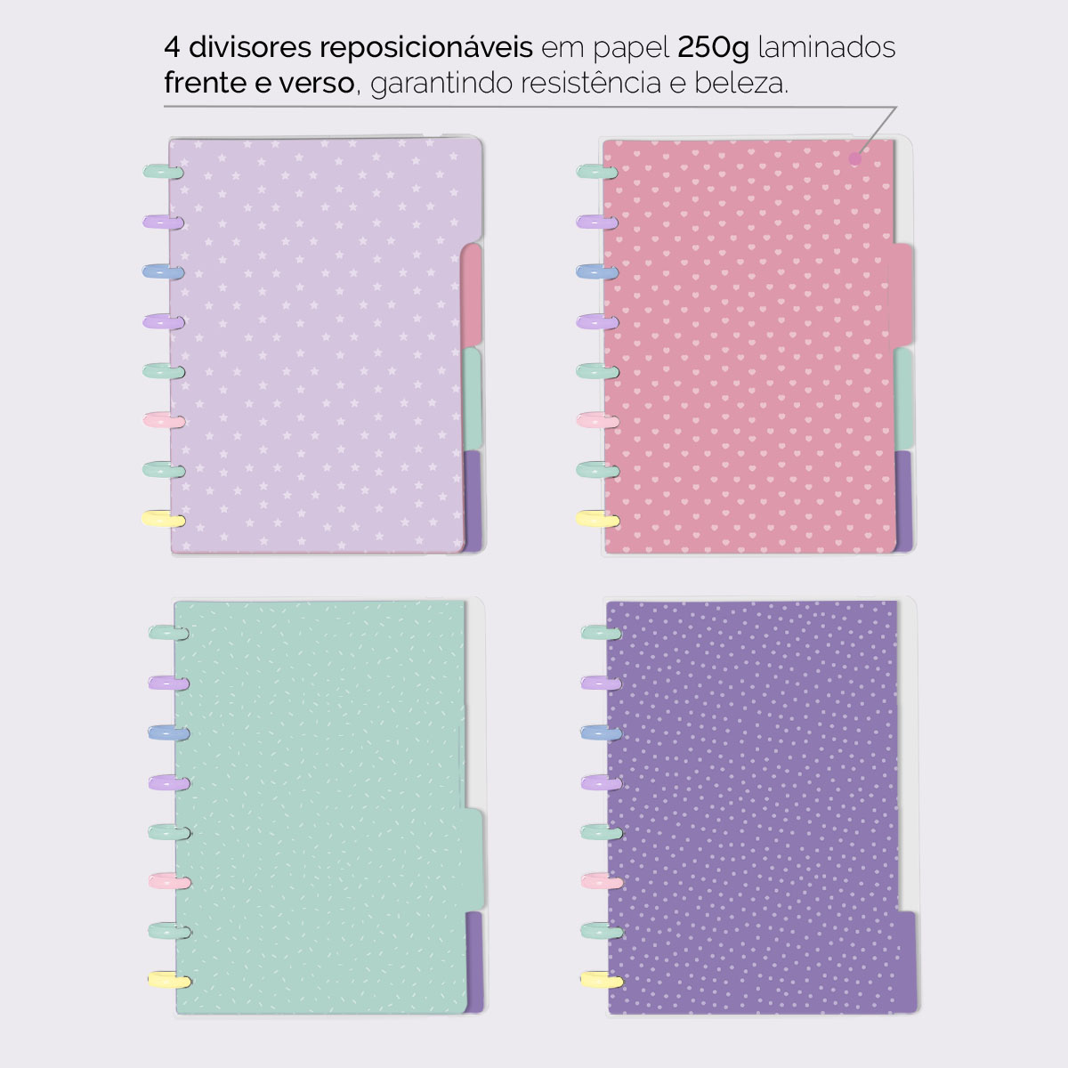 A capa é feita em PP com impressão digital UV de alta definição, acompanha 4 lindas divisórias, que você pode colocar em qualquer local do caderno, funcionando como o guia perfeito para sua organização.