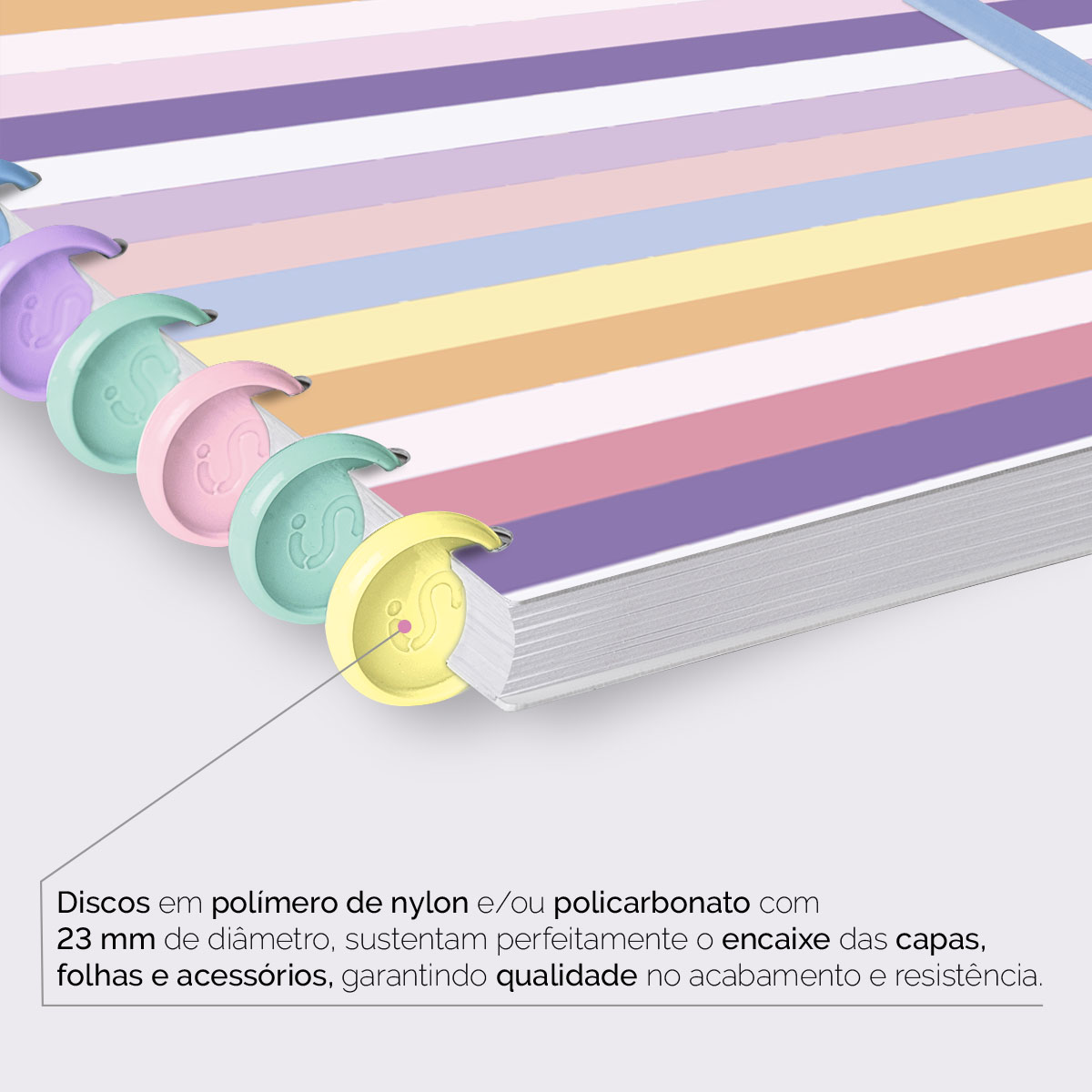 Encadernado com 11 discos M de 23mm em polímero de nylon e/ou policarbonato coloridos, fabricados no Brasil.