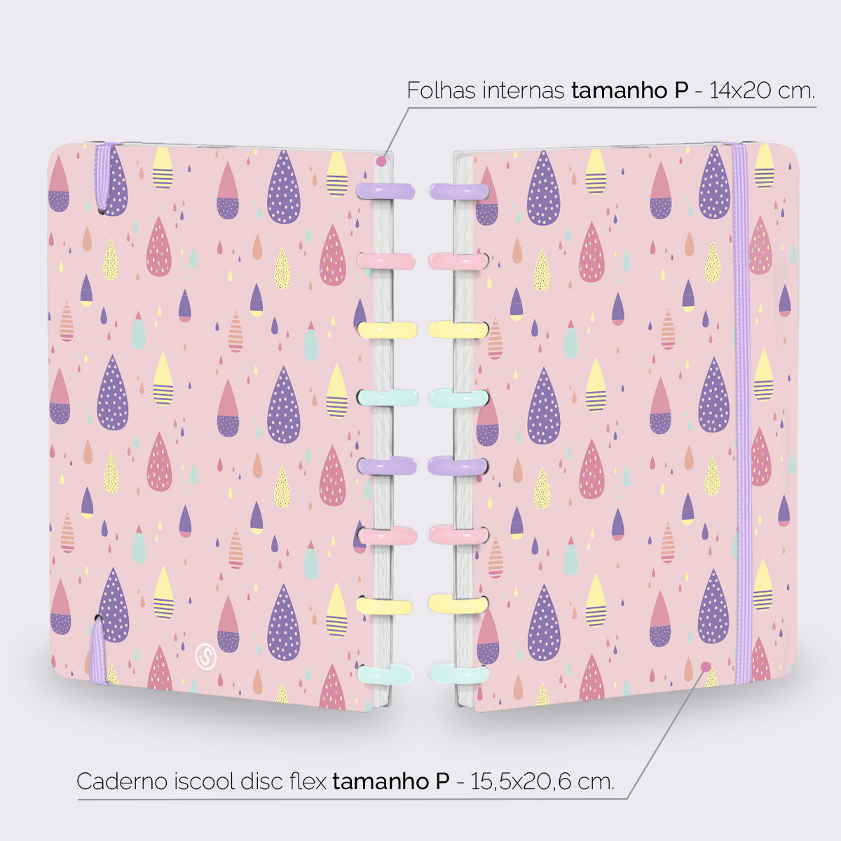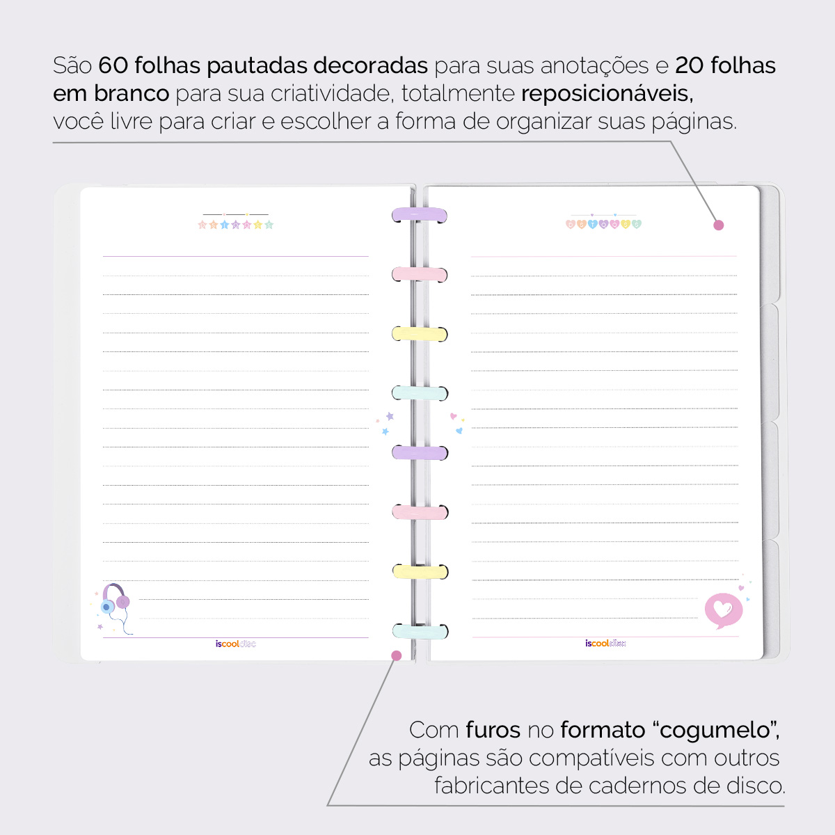 Além de tudo isso, o ISCOOL DISC FLEX, conta com detalhezinhos que fazem toda diferença: elástico removível para fechamento da capa, muito mais estilo e privacidade para suas anotações; bolsa plástica para guardar seus rascunhos, referências, lembretes, documentos e uma cartela de adesivos incríveis, para que você possa personalizar seu caderno do seu jeitinho!