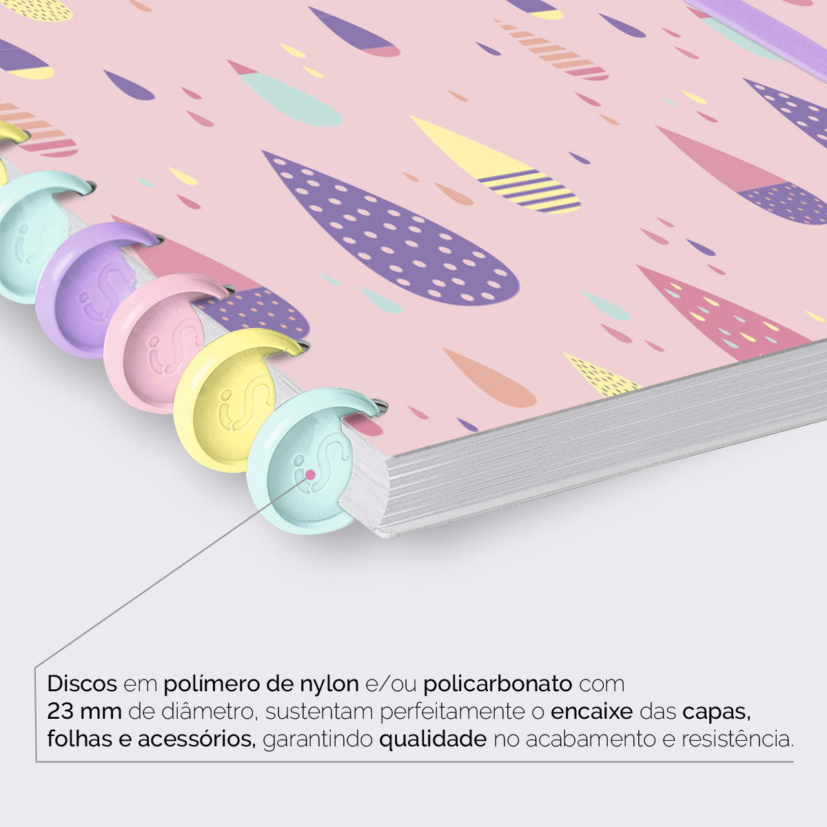 Encadernado com 11 discos M de 23mm em polímero de nylon e/ou policarbonato coloridos, fabricados no Brasil.