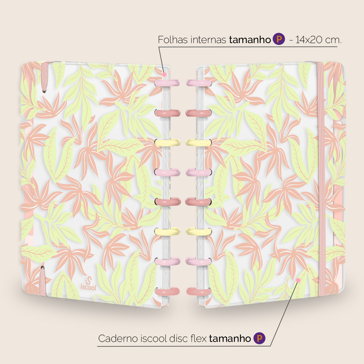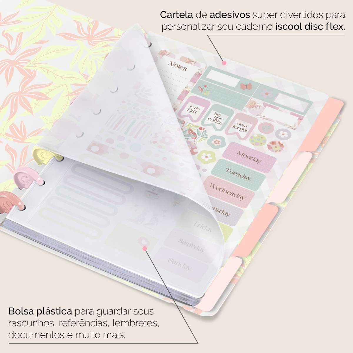 Além de tudo isso, o ISCOOL DISC FLEX, conta com detalhezinhos que fazem toda diferença: elástico removível para fechamento da capa, muito mais estilo e privacidade para suas anotações; bolsa plástica para guardar seus rascunhos, referências, lembretes, documentos e uma cartela de adesivos incríveis, para que você possa personalizar seu caderno do seu jeitinho!
