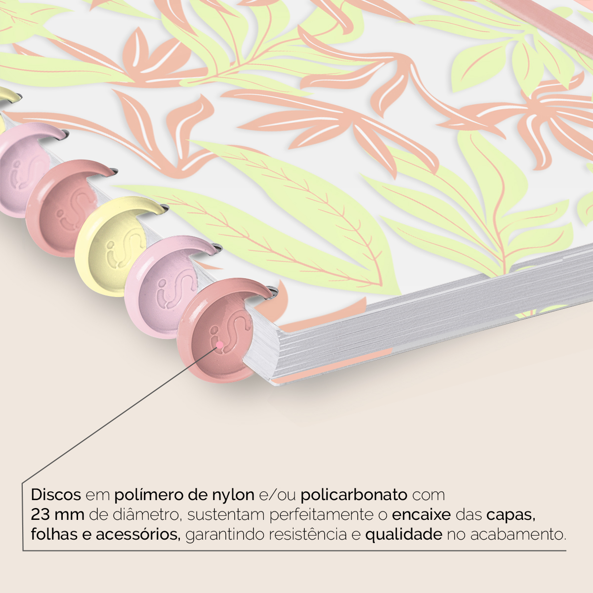 Encadernado com 11 discos M de 23mm em polímero de nylon e/ou policarbonato coloridos, fabricados no Brasil.