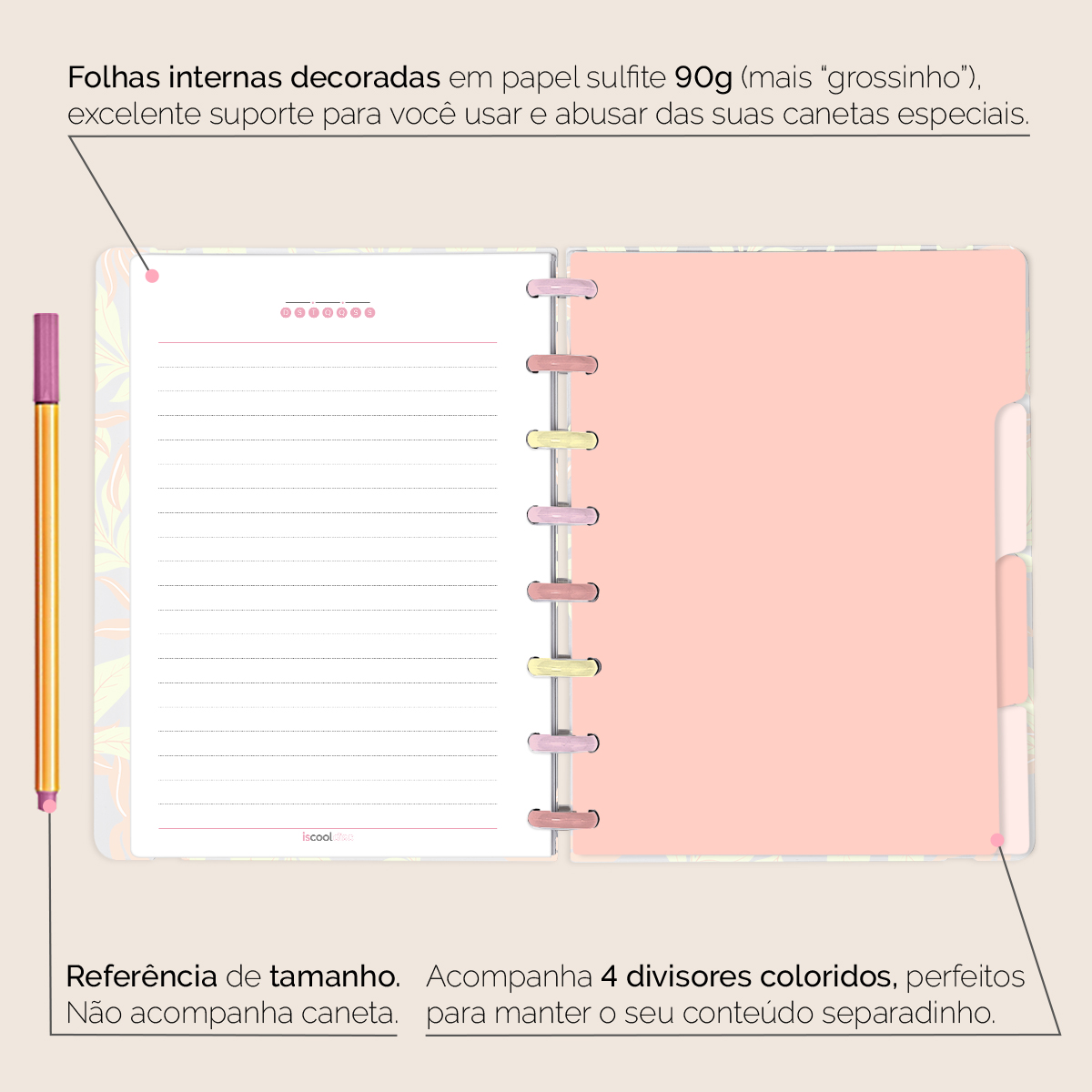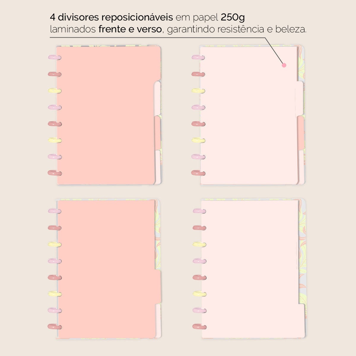 A capa é feita em PP com impressão digital UV de alta definição, acompanha 4 lindas divisórias, que você pode colocar em qualquer local do caderno, funcionando como o guia perfeito para sua organização.