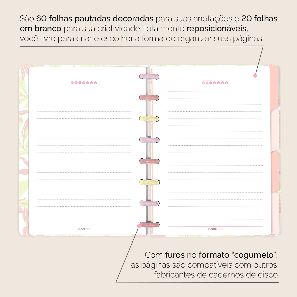 O miolo conta com 60 folhas pautadas decoradas em papel sulfite 90g, (aquele papel mais “grossinho”) para que você use e abuse das suas canetas especiais e 20 folhas em branco, ideais para explorar seu lado mais criativo.