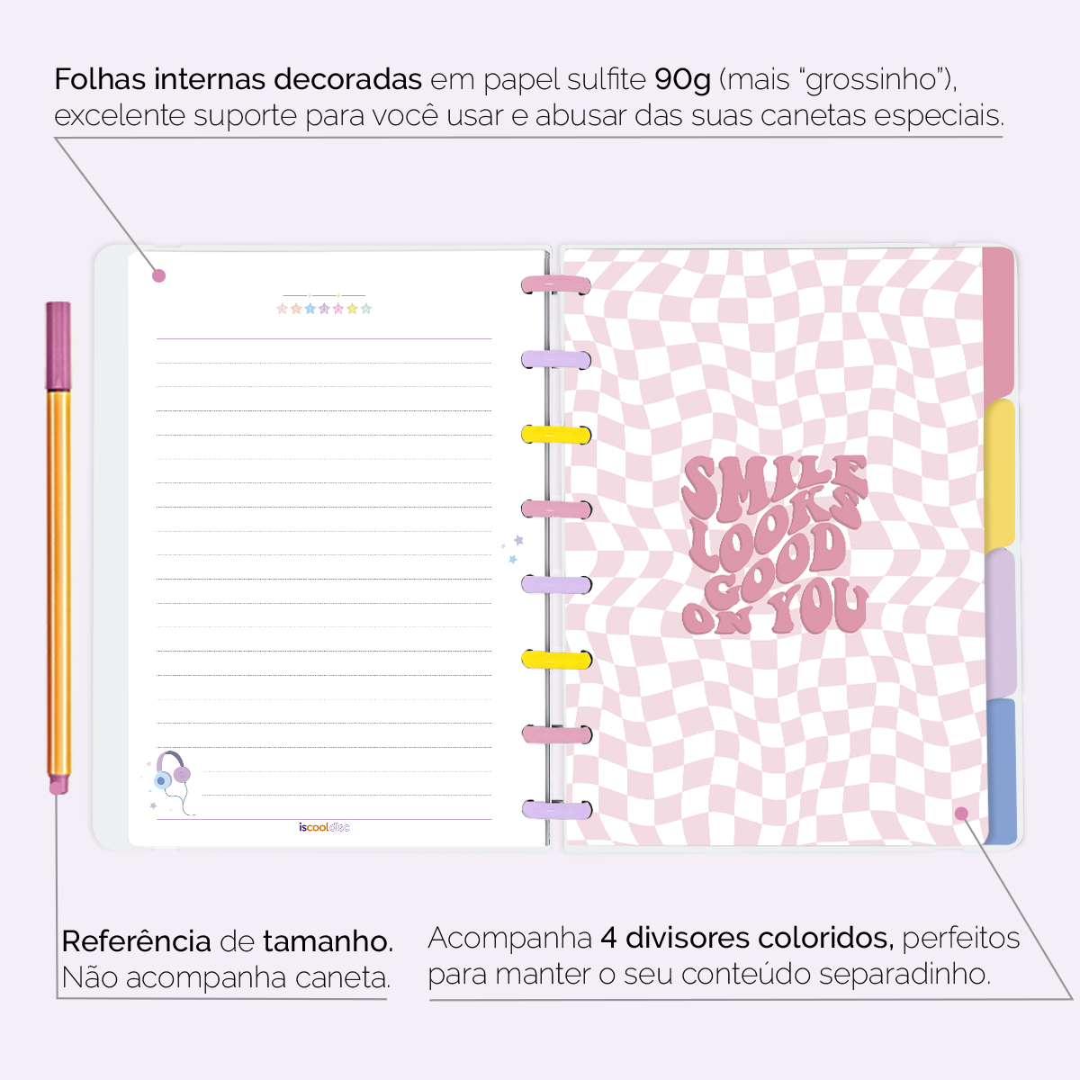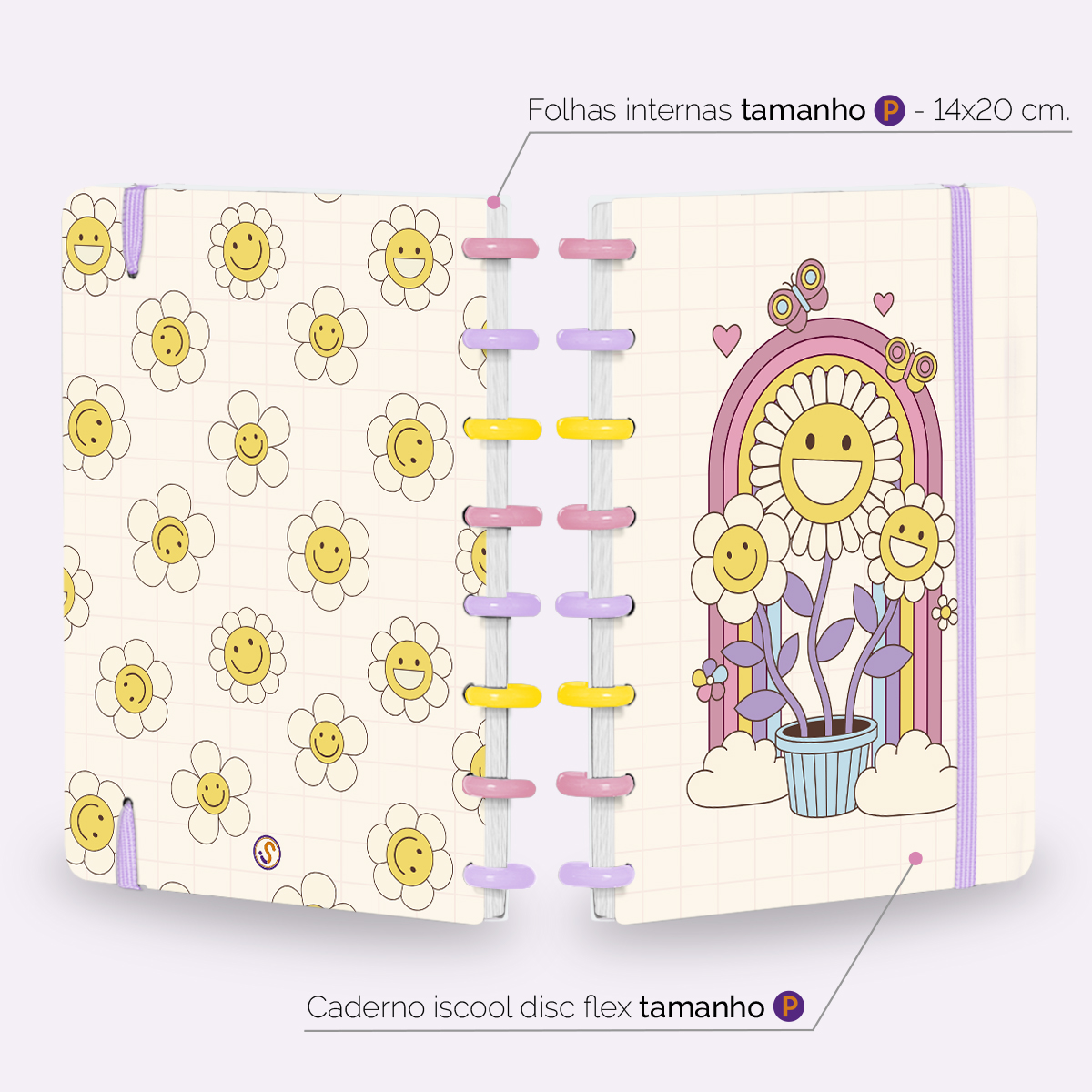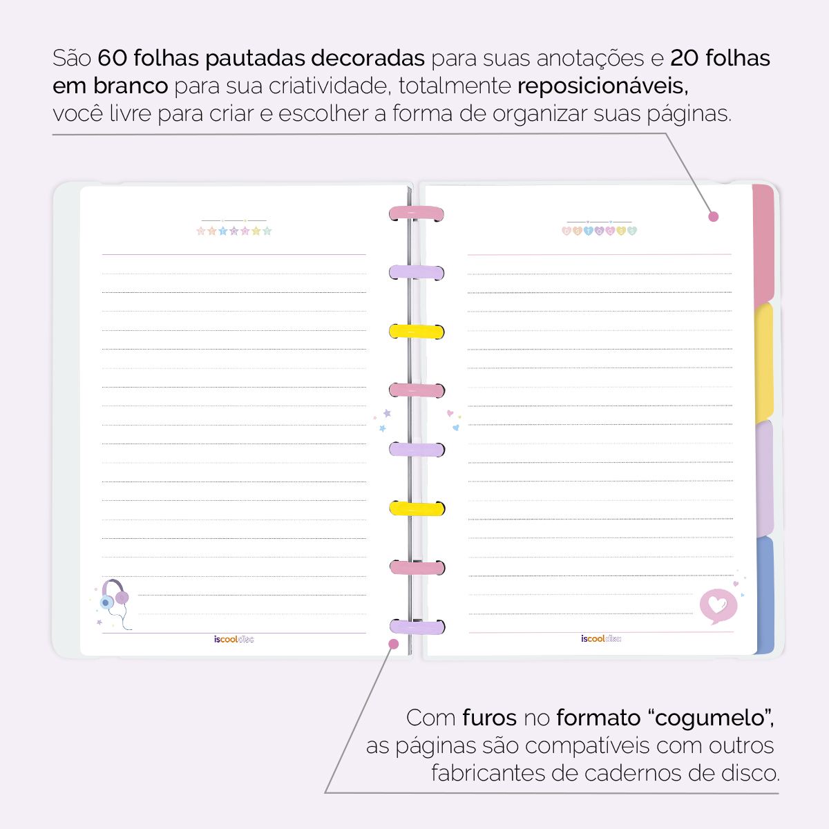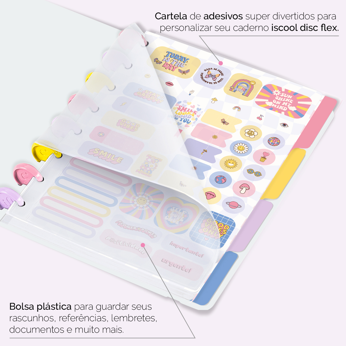Além de tudo isso, o ISCOOL DISC FLEX, conta com detalhezinhos que fazem toda diferença: elástico removível para fechamento da capa, muito mais estilo e privacidade para suas anotações; bolsa plástica para guardar seus rascunhos, referências, lembretes, documentos e uma cartela de adesivos incríveis, para que você possa personalizar seu caderno do seu jeitinho!