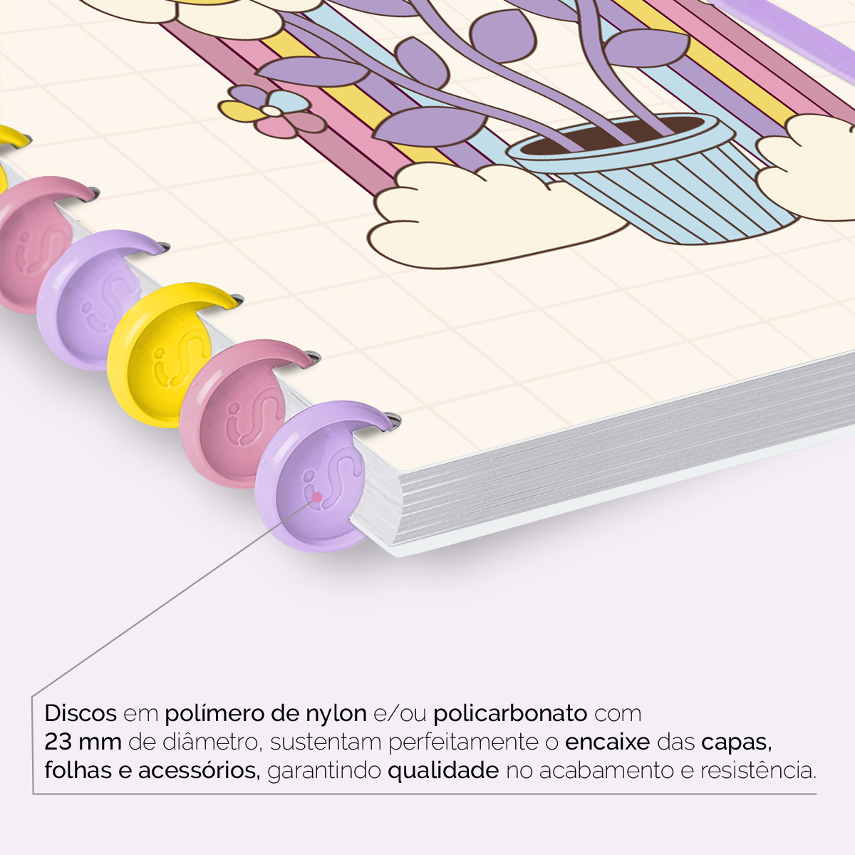 Encadernado com 11 discos M de 23mm em polímero de nylon e/ou policarbonato coloridos, fabricados no Brasil.
