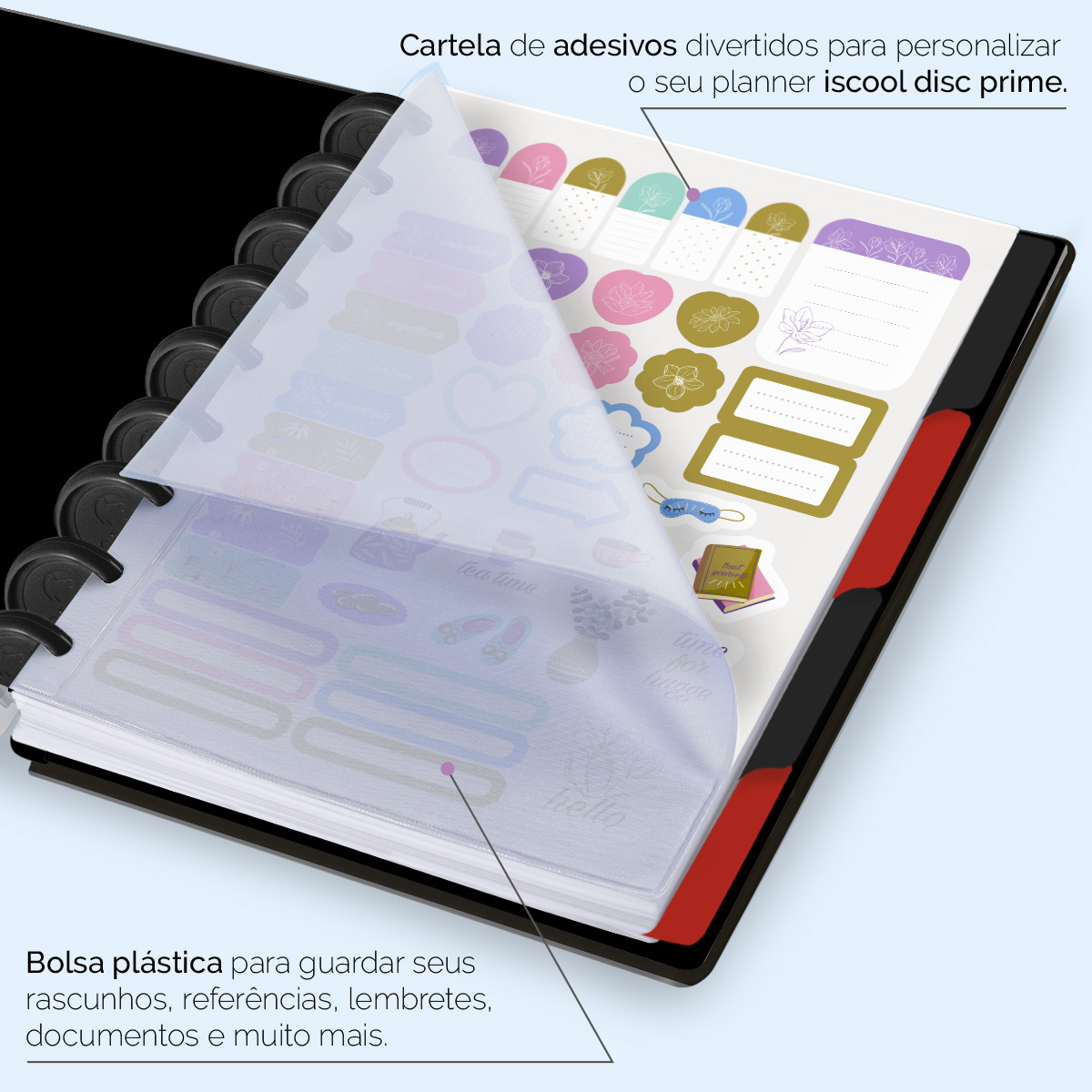 Além de tudo isso, o ISCOOL DISC Planner Permanente conta com detalhes que fazem toda a diferença: elástico para fechamento da capa, proporcionando muito mais estilo e privacidade para suas anotações; bolsa plástica para guardar seus rascunhos, referências, lembretes e documentos; e uma cartela de adesivos incríveis para que você possa personalizar o planner do seu jeitinho!