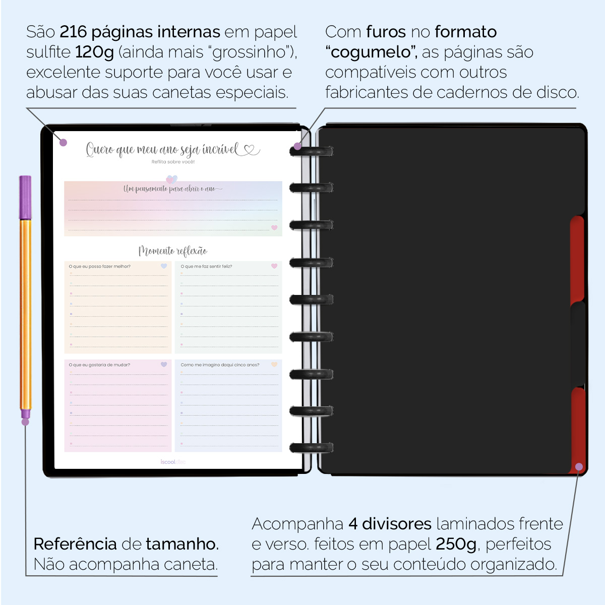O miolo conta com páginas decoradas em papel sulfite 120g (aquele papel ainda mais "grossinho"), para que você use e abuse das suas canetas especiais. Com furos no formato de "cogumelo", você poderá dar um "up" nele com nossos refis, além de ser compatível com outros fabricantes de cadernos e planners de discos.