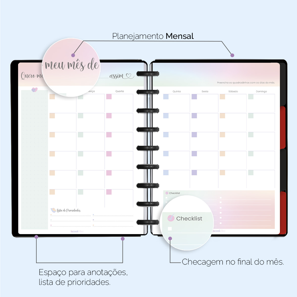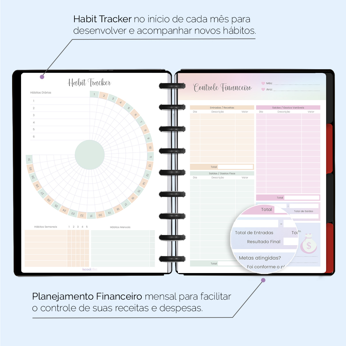 No início de cada mês, há um planejamento mensal, facilitando visualmente as suas principais anotações, um "Habit Tracker" para você desenvolver novos hábitos ou controlar os mais importantes, e ainda um planejamento financeiro, facilitando o controle das suas receitas e despesas, além de inúmeras outras funcionalidades.