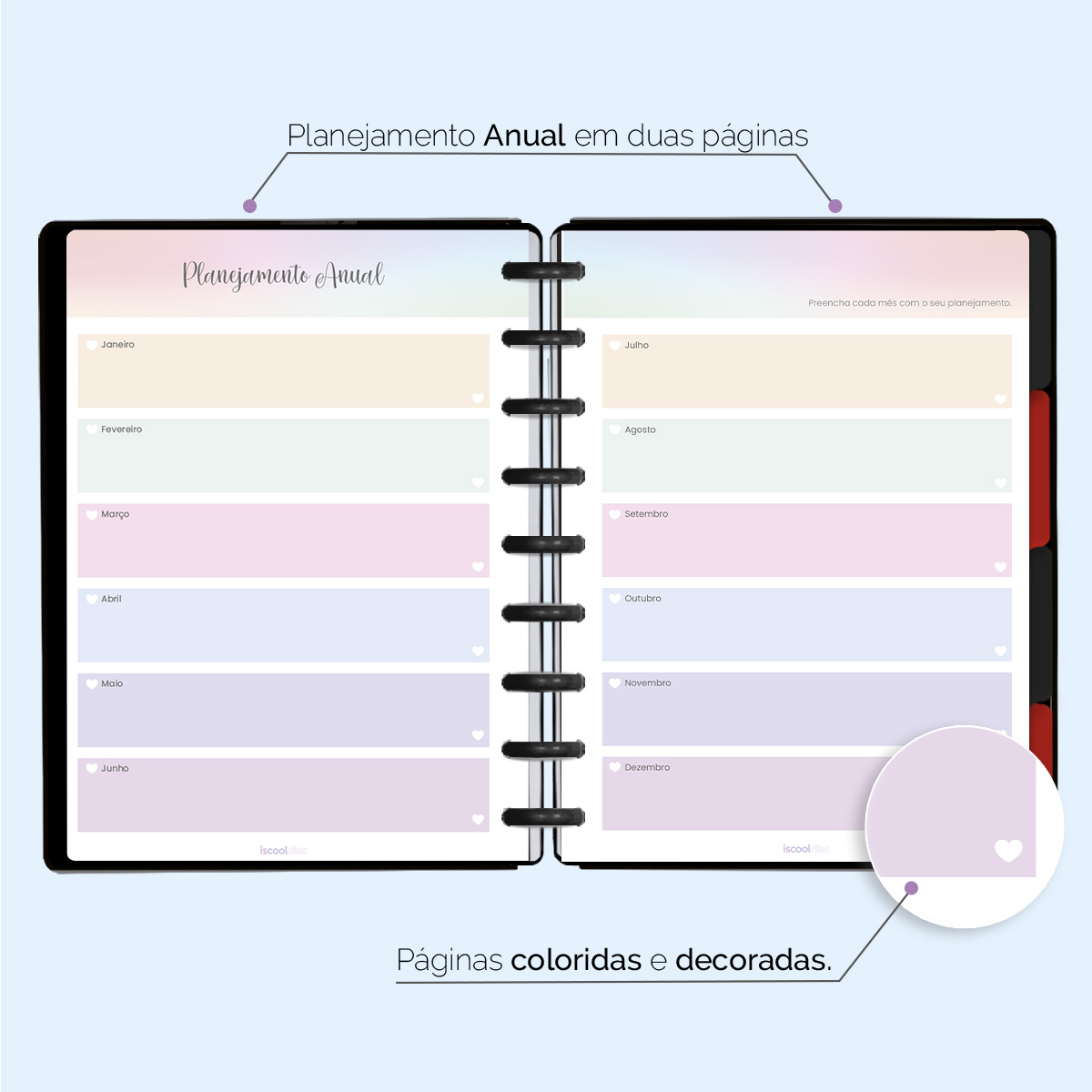 O ISCOOL DISC Planner Permanente foi criado especialmente para ajudar você a alcançar todas as suas metas e objetivos pessoais. É um planner totalmente customizável, no qual os elementos são reposicionáveis. Você pode montá-lo como preferir, deixando sua criatividade fluir livremente.