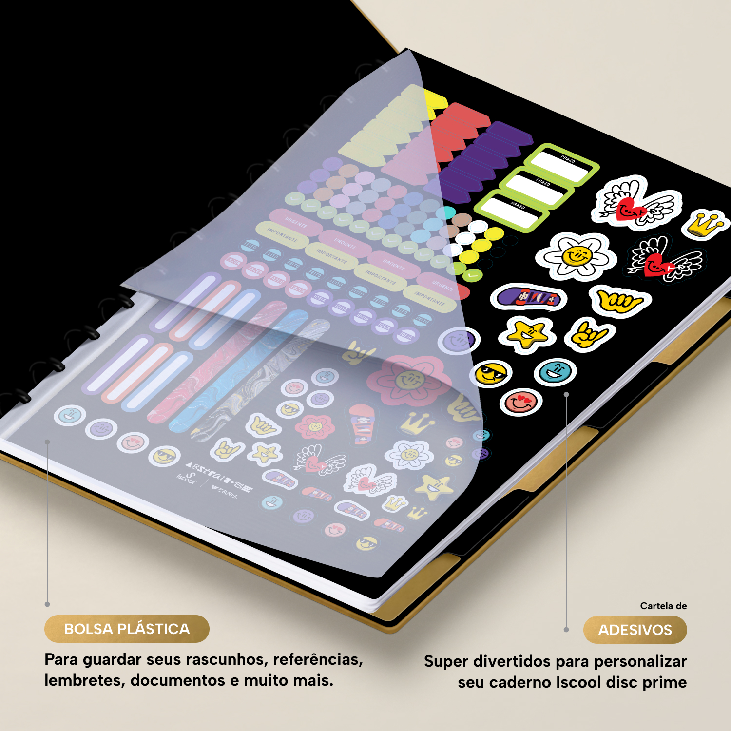 Além de tudo isso, o iscooldisc Prime conta com detalhes que fazem toda a diferença: elástico para fechamento da capa, muito mais estilo e privacidade para suas anotações; bolsa plástica para guardar seus rascunhos, referências, lembretes, documentos e uma cartela de adesivos incríveis, para que você possa personalizar seu caderno do seu jeitinho!