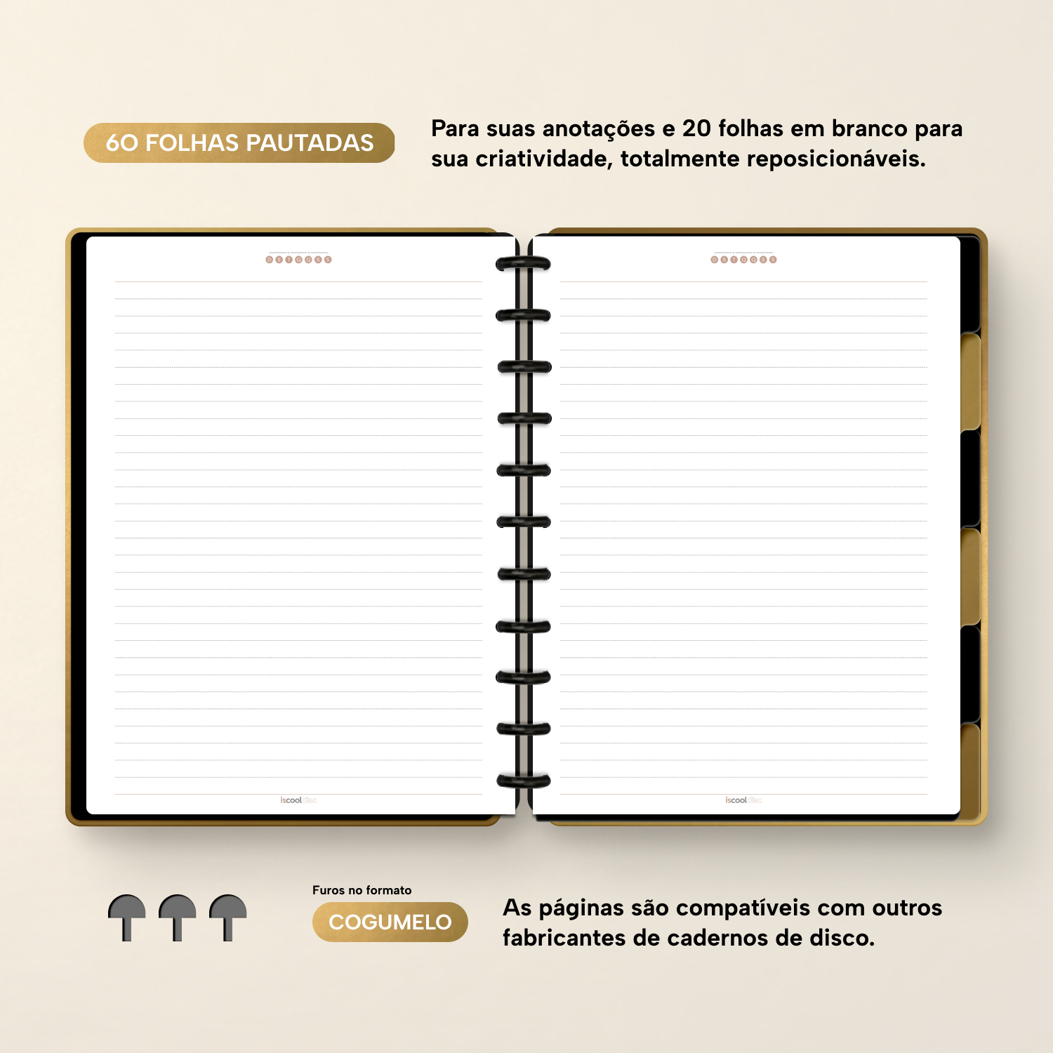 Com furos no formato de “cogumelo”, você poderá dar um “up” em seu caderno com nossos refis, além de ser compatível com outros fabricantes de cadernos de discos.