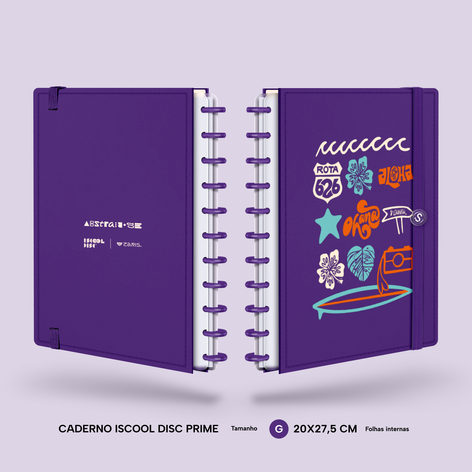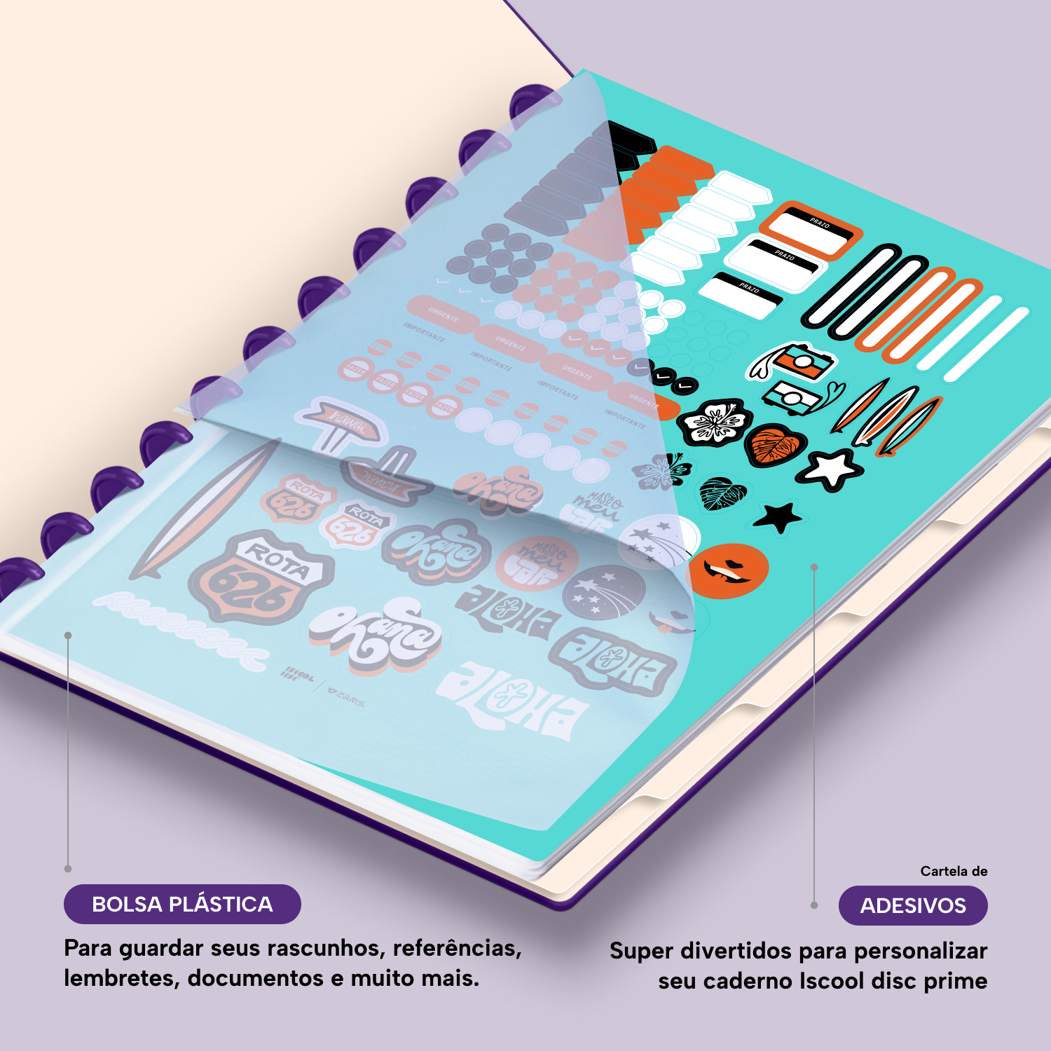Além de tudo isso, o iscooldisc Prime conta com detalhes que fazem toda a diferença: elástico para fechamento da capa, muito mais estilo e privacidade para suas anotações; bolsa plástica para guardar seus rascunhos, referências, lembretes, documentos e uma cartela de adesivos incríveis, para que você possa personalizar seu caderno do seu jeitinho!