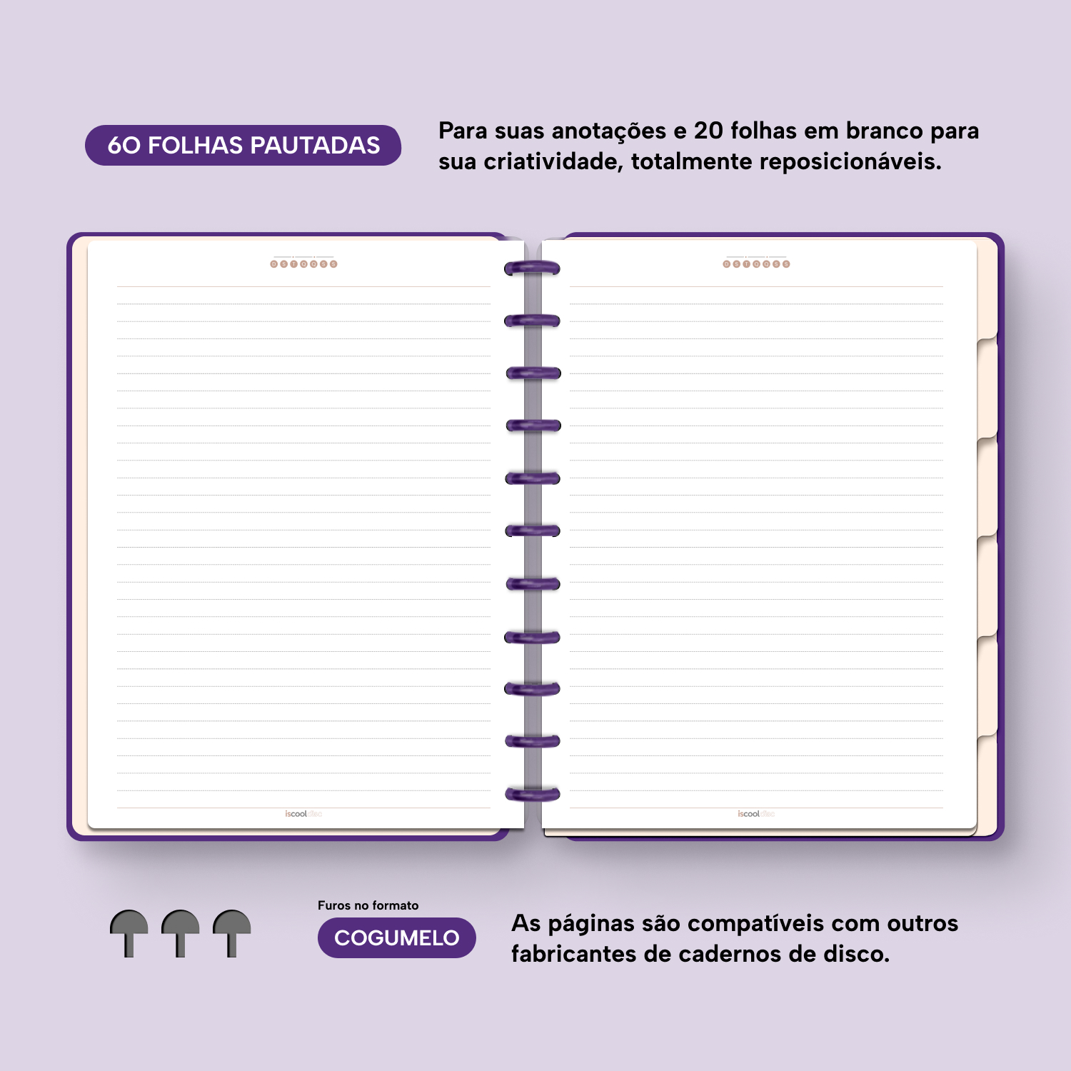 Com furos no formato de “cogumelo”, você poderá dar um “up” em seu caderno com nossos refis, além de ser compatível com outros fabricantes de cadernos de discos.