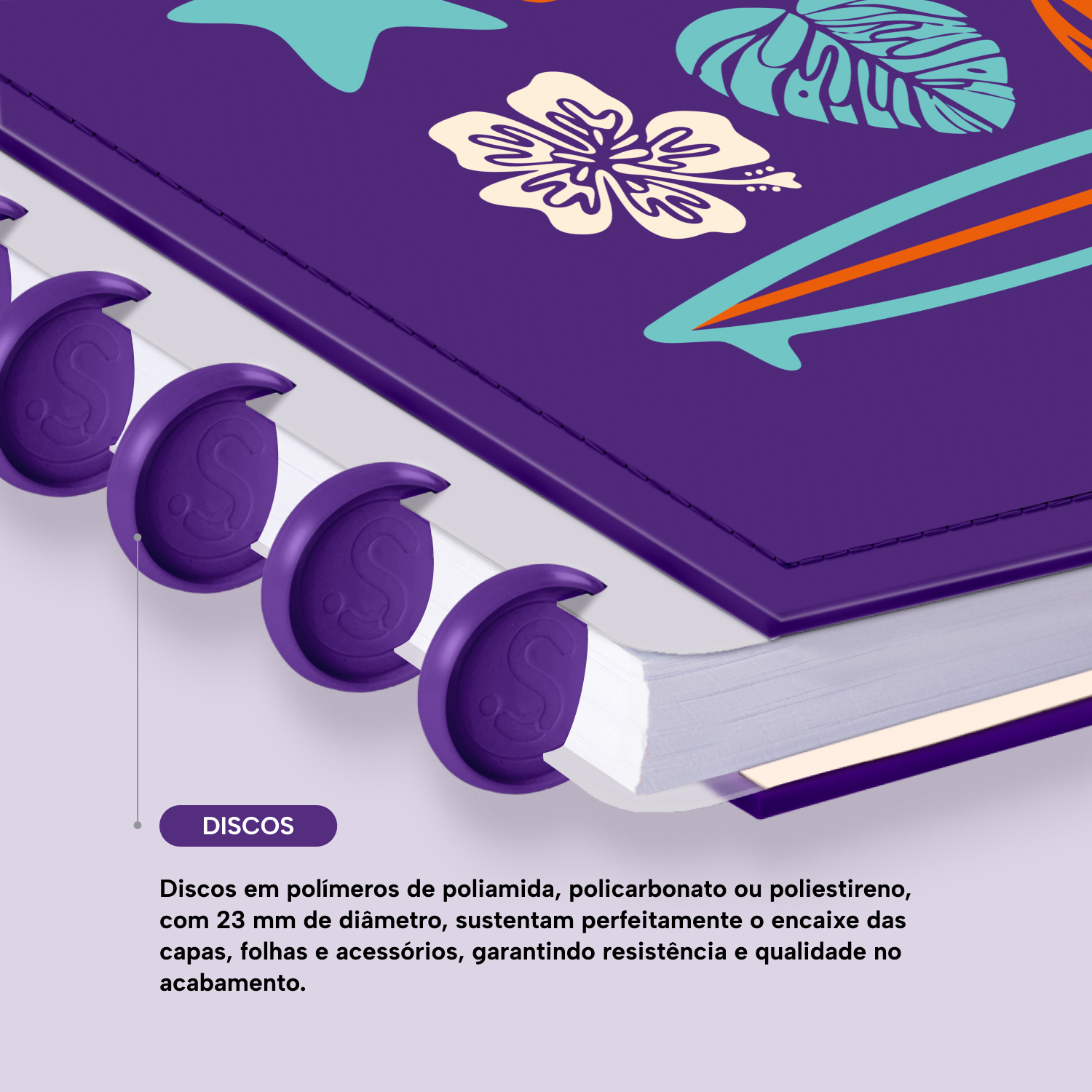 Encadernado com 11 discos M de 23mm em polímero de nylon e/ou policarbonato coloridos, fabricados no Brasil.