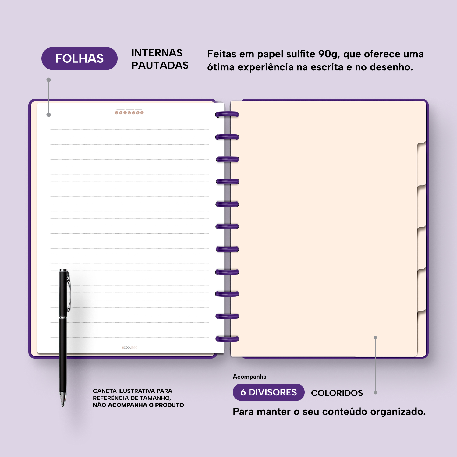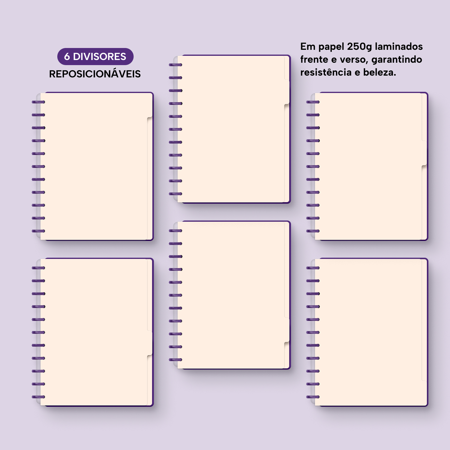 A capa é dura, com impressão digital de alta definição, e acompanha 6 lindas divisórias que você pode colocar em qualquer local do caderno, funcionando como o guia perfeito para sua organização.