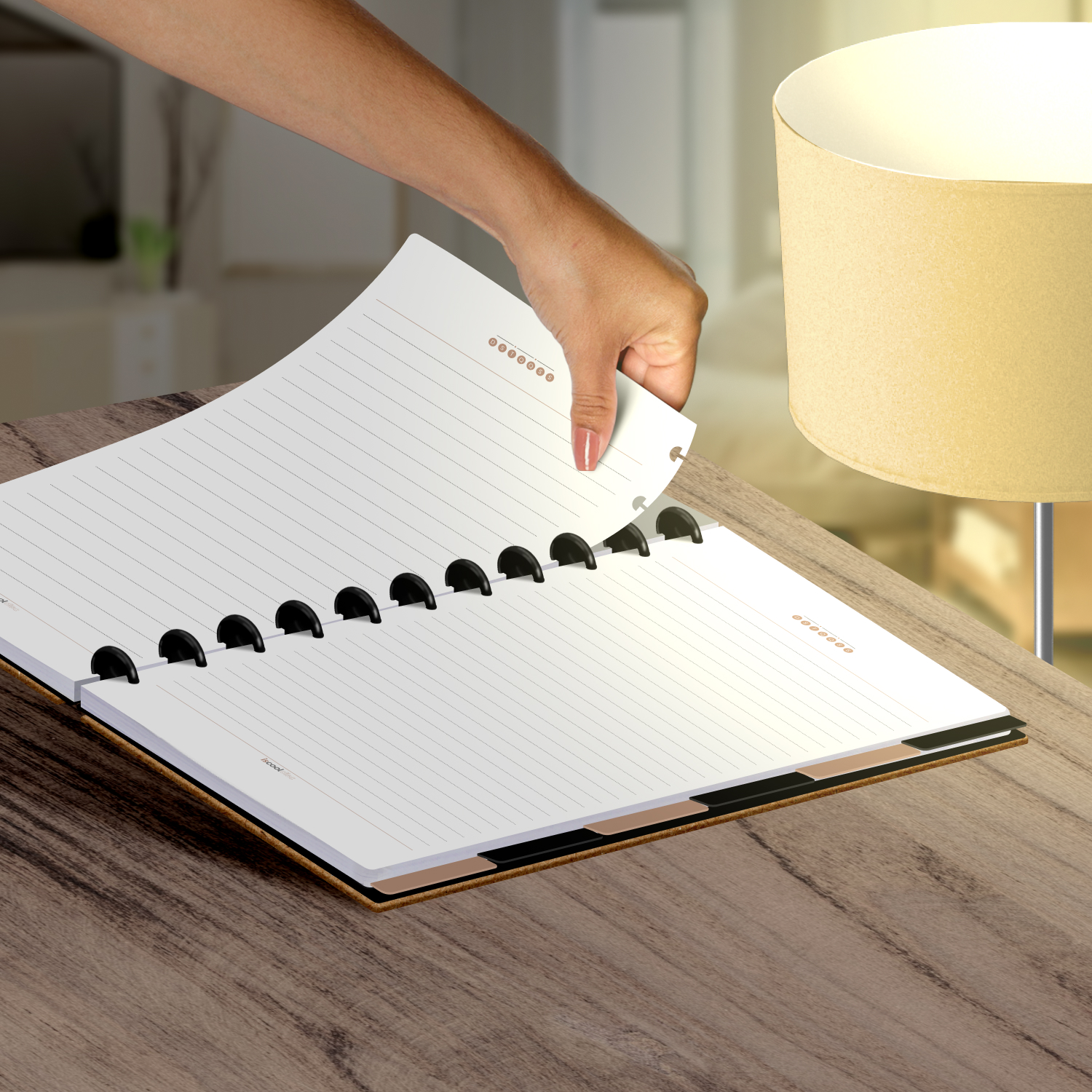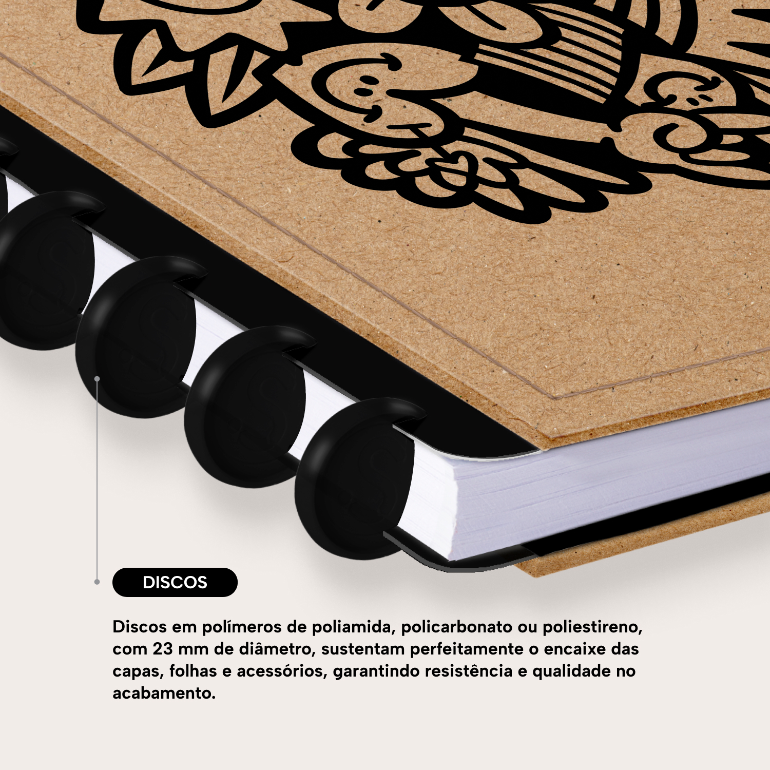 Encadernado com 11 discos M de 23mm em polímero de nylon e/ou policarbonato coloridos, fabricados no Brasil.